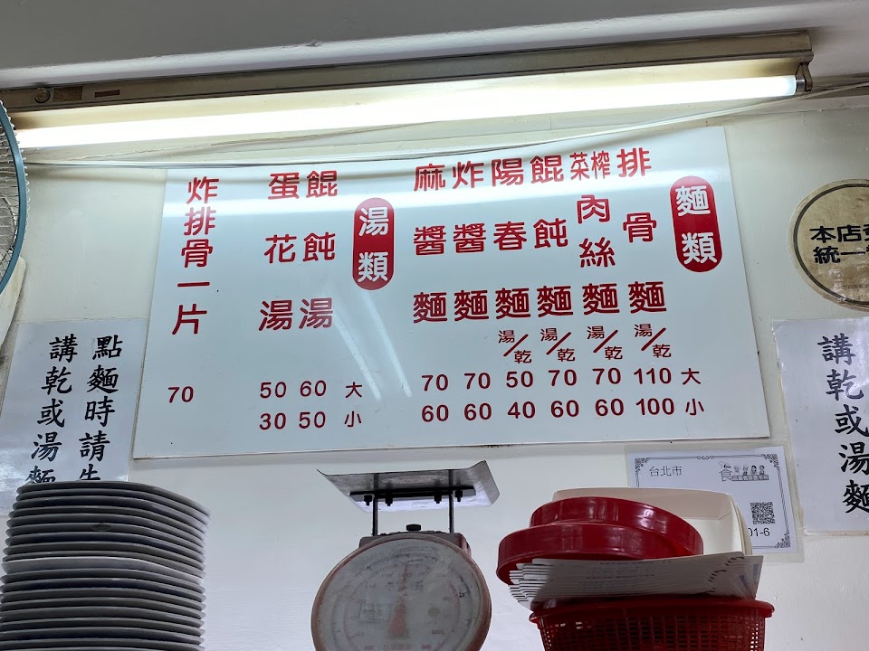 林森南路口附近的老店,平常中午附近上班族相當多,用餐的地方有兩個,一個在點餐的地方,一個是在對面,都是點完餐再入座。 因為大家幾乎都點排骨麵,所以店家會先把麵和排骨準備起來,旁邊油炸爐也是不停的炸排骨,固定都會有一塊排骨準備在砧板上,如果有人點就直接拿給他。 菜單貼在牆上,就直接看牆上點,想吃乾麵配排骨,建議就直接點乾的排骨麵,因為點小炸醬麵+排骨要140元,點乾的排骨麵只要110元。 除了牆上的菜單以外,還有小菜可以點,滷蛋是10元,豆干3片和海帶是30元,豆皮、豬頭皮是40元。 這次消費發現排骨從3年前到現在都是70元,反而是排骨麵從95元漲成是110元。 店面這裡的位置只有二個六人長桌和一張四人桌,因為空間小,桌上沒有隔板,環境不是很理想。 點好餐就先拿排骨入座,入座後要先找店家自製的辣椒醬油和胡椒粉,這辣椒醬油裡有紅辣椒、青辣椒和豆鼓,這個加在排骨、麵和小菜上都很加分。 現炸的排骨果然是招牌,排骨的份量給得很足,原本一片排骨如果太小還會補一小塊,一份會有4塊;味道上吃起來有點甜,很像小時候的古早味,這跟醃的醬料有關;口感上則是厚實飽滿、外酥肉嫩,有骨頭的部分直接用手拿著啃更美味。 乾的排骨麵上面會加兩種配料,之前來吃會加炸醬和泡菜,這次吃是加炸醬和榨菜肉絲,麵條是偏厚硬的陽春麵,吃起來有咬勁。 點乾麵附的湯是沒有料的蔬菜清湯,幾乎沒有味道,就只是吃完排骨讓嘴巴不會太乾。 剛才加在排骨、麵和小菜上的辣椒醬油可以直接吃,尤其是青辣椒,青辣椒幾乎是沒有什麼辣度,咬起來特別香。 結帳則是吃完離開時再結。 這裡雖然環境不理想,但排骨確實好吃,有點甜甜的口味會讓人意猶未盡。