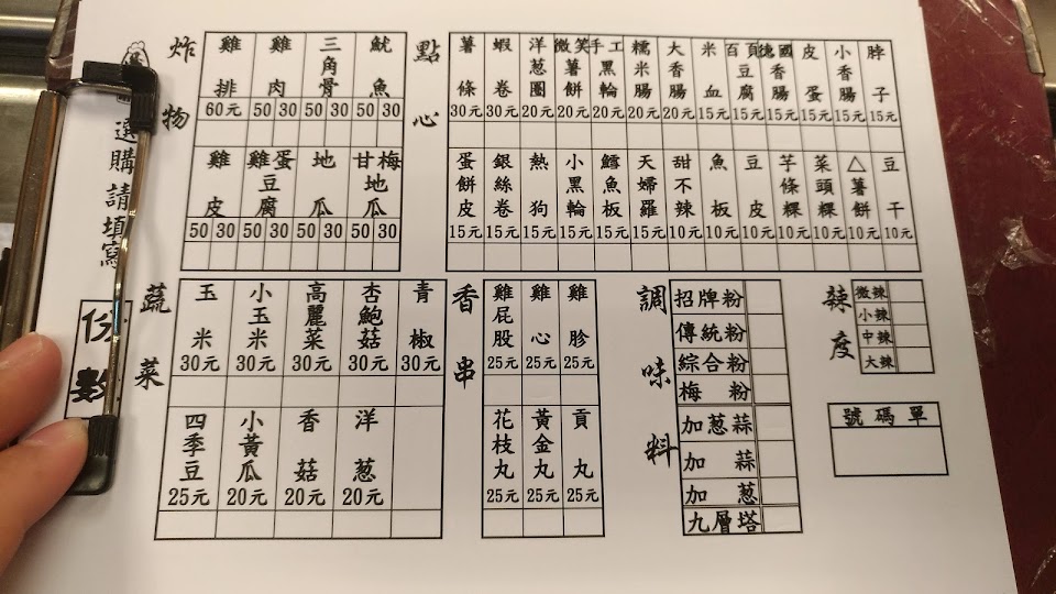 食材都在玻璃櫥窗中避免路邊塵灰加料.這超加分(★),食材種類多樣選擇客人以劃單方式點選食材+價格透明,讓客人知道勾選價後不會超出預算,炸工不錯 鹹穌雞不會太柴 黑輪片不會被炸成黑輪餅乾(吃脆的可備註)有的蔬菜類會分盒裝乾.濕分裝 加分(★),調味粉+佐料 可自由選搭 讓客人可配合出當天自己想吃的味道,2種調味粉各有人支持,點單後先結帳會給與叫號牌,會有LED跑號單讓顧客知道現在跑到幾號。