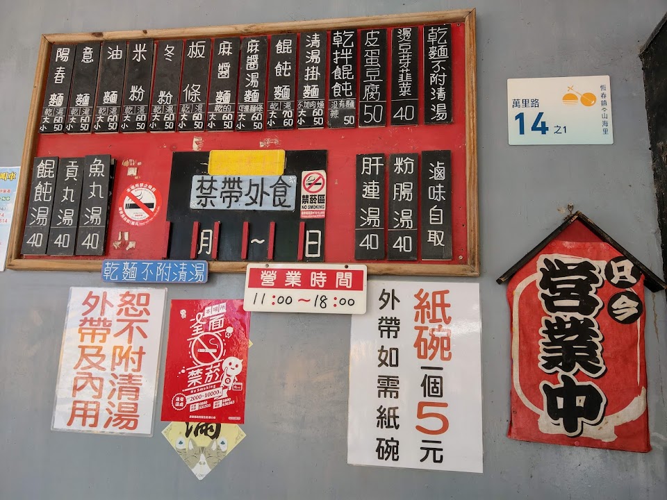 萬里桐潛水中心旁有名的麵店,價格高,味道中規中矩,點了麻醬麵、陽春麵、清湯掛麵都普通而已,麻醬麵也沒什麼醬,分數高應該是位置好方便,一潛水上來就有得吃 …
