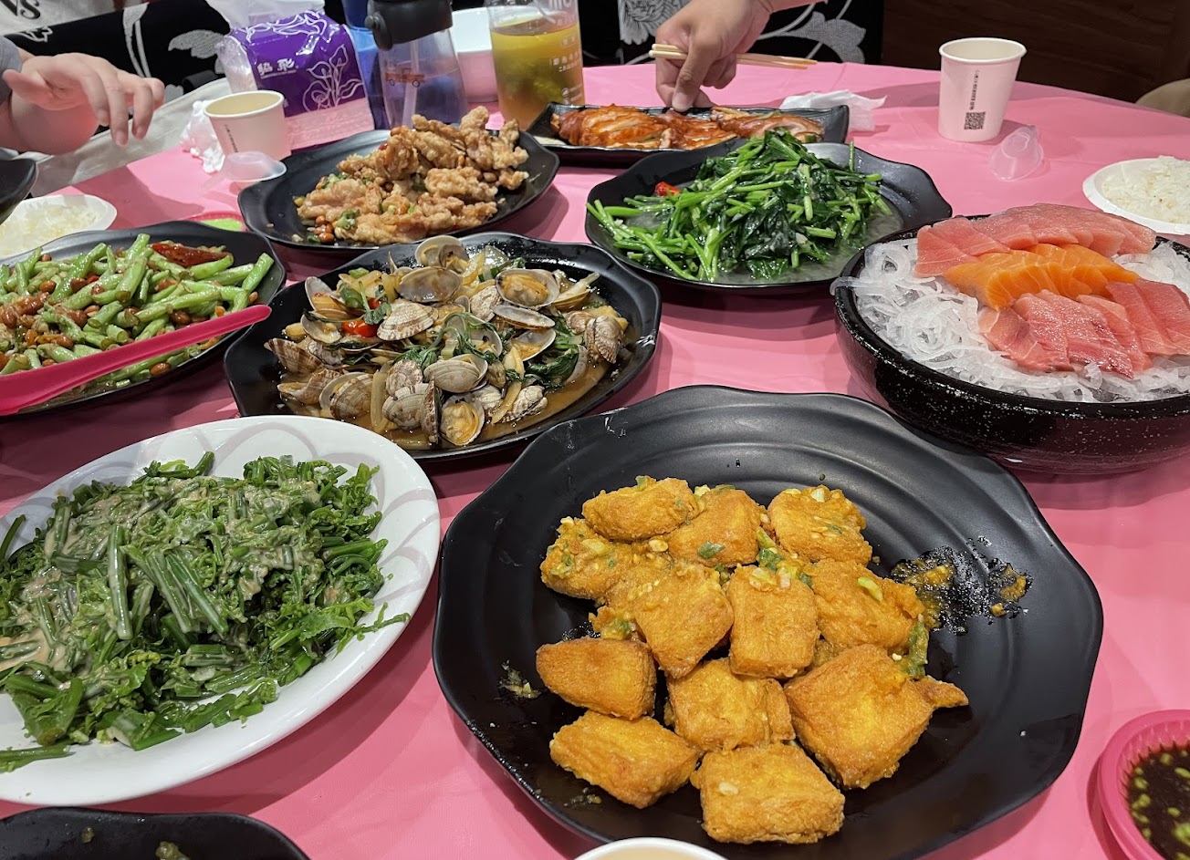 檸檬蛤蜊 綜合生魚片 鳳梨蝦球 味噌鮮魚湯 蛋炒雨來菇 鹽酥軟絲 金沙豆腐 酥炸肥腸 魚香茄子