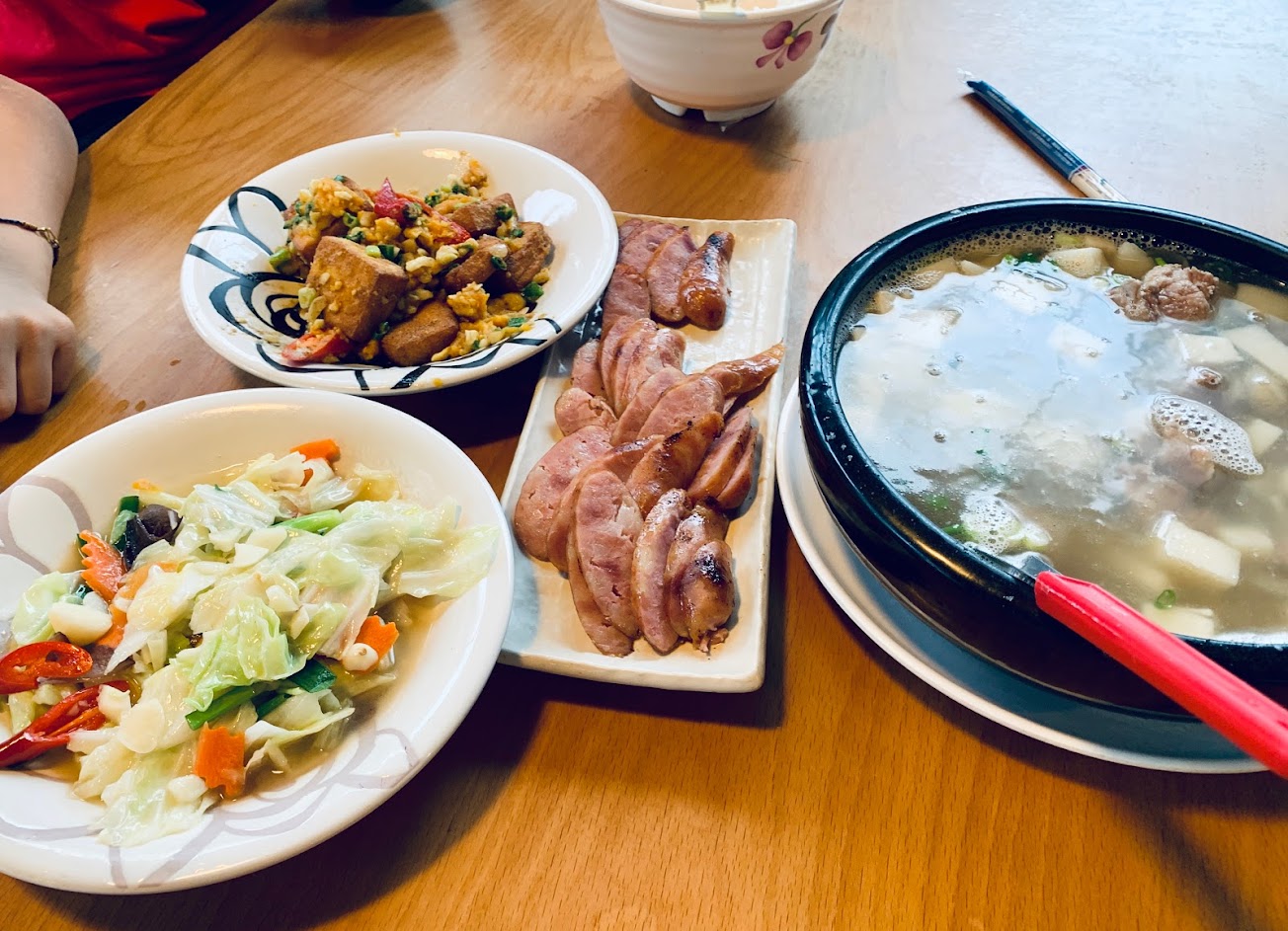 每道菜都不錯,剝皮辣椒雞湯很甜好喝,煎黃魚外皮酥脆好吃,油雞腿跟豬腳都很Q彈,飛魚卵香腸鹹度剛好?松阪豬份量稍少,苦瓜鹹蛋有點不夠鹹? …