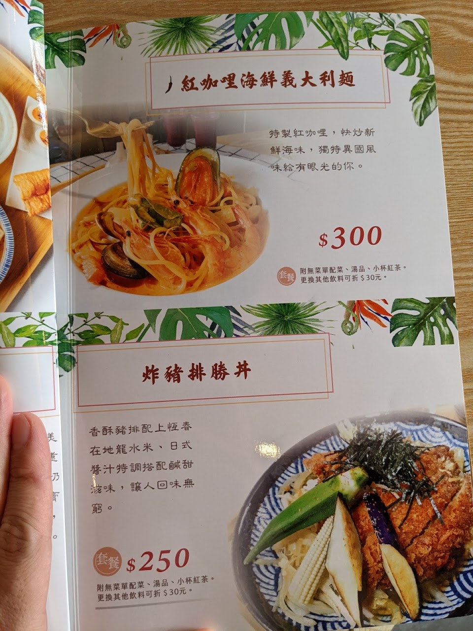 點了綠咖哩雞飯、蔬食義大利麵、月亮蝦餅(十足的蝦肉花枝肉)、炸湯圓、羅旺子氣泡飲。餐點都很美味又份量十足。用餐環境乾淨氛圍不錯。無意間發現的餐廳、很令人驚艷。推!??