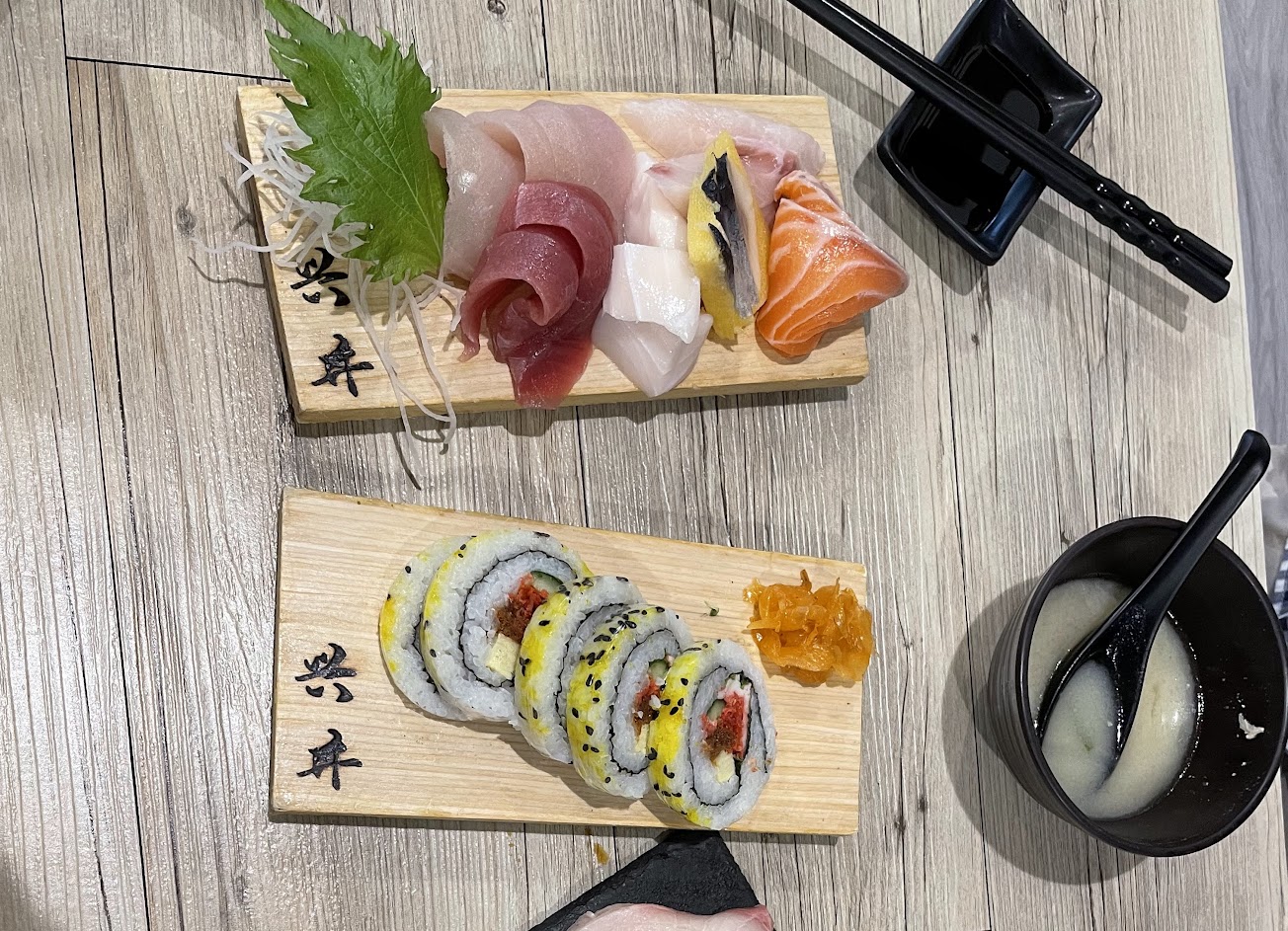 我們點了味噌湯及生魚片蓋飯,cp值超高,物超所值。值得一提的是芥末醬非常純,嗆辣夠勁,有機會還會再來。