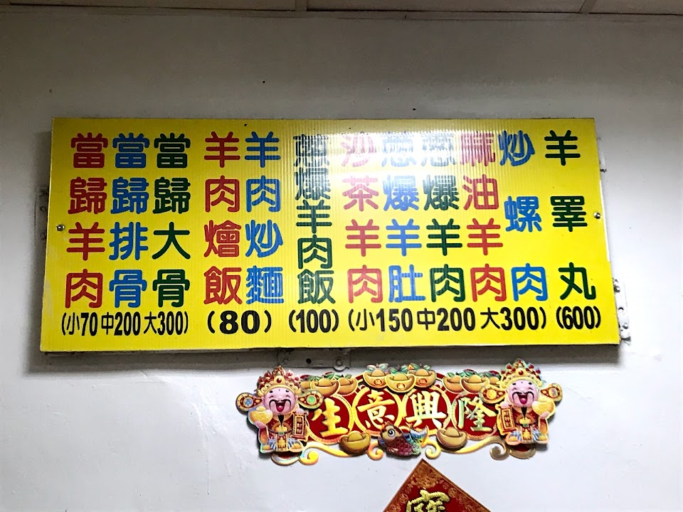 炒麵有點像陽春麵的麵條,醬汁是比較稠的,羊肉片沒有很多;蔥爆羊肉是配油菜(應該),肉片比炒麵多;湯個人覺得還行,但同伴認為當歸味不夠重,有醬料可沾;螺肉可以,但單吃會感覺比較鹹,適合當下酒菜。總結來說,CP值不算太高,份量算夠的。