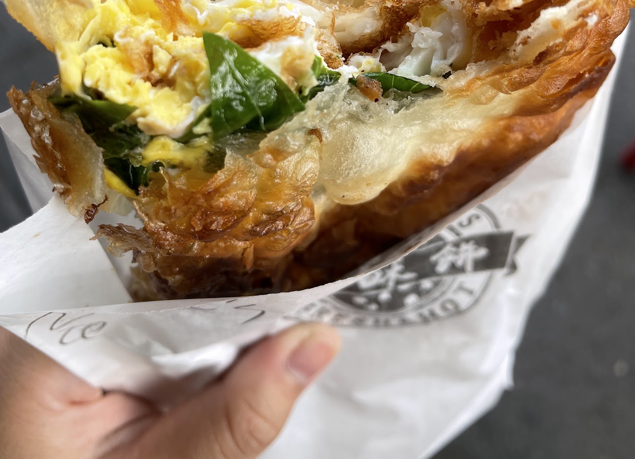 吃起來很像炸蛋油餅,酥酥脆脆的餅皮,和煎得油香的九層塔雞蛋,但敗筆是醬料,太鹹太普通,建議不要加比較好吃