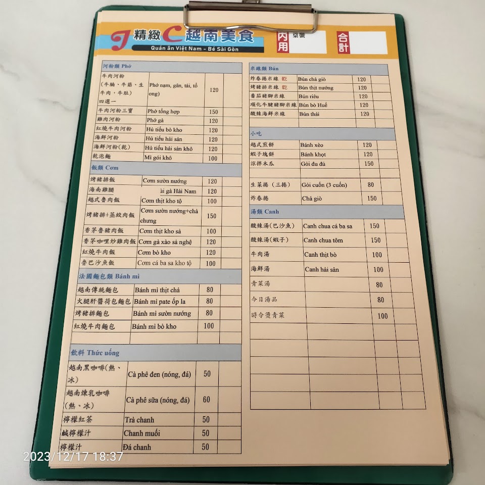 烤豬排法國麵包$80(無圖支援) 生春捲$80 沙巴魚酸辣湯$150(無圖支援) 魯沙巴魚飯$100(無圖支援) 生牛肉河粉$120(無圖支援) 第一次看到魯沙巴魚飯很好奇所以點來試試看XD外帶用一般便當盒裝,一看就很像是鯖魚罐頭的魚鋪在上面。一入口有一個蠻重的魚味,平常吃海鮮會怕的人斟酌一下再點~旁邊格子會搭配菜,沒有太異國風情的小菜 但是分量很夠,一個大男生吃也會很撐的大小!好奇的可以點看看,是外面蠻少見品項。 酸辣湯就超級讚啦??喝起來酸甜味,夠酸!阿如果吃不太酸的就要考慮了喔 本人超愛,裡面配料跟魚份量也算多,$150好像還可以 生春捲外帶也是三條完整沒有切過,如果帶回家還要切一下才比較好入口(小小建議可以幫忙切段啦) 口味好像跟一般越式店吃到的不一樣,有種很衝的葉子味,但吃不出來是哪種香料還是捲在裡面的生菜 烤豬排法國麵包其實咬下去挺軟的,好像沒有再回烤過 個人喜歡酥脆感所以對我來說很還好 豬排蠻香的但是也不容易咬斷,其他內部配料有小黃瓜、醃漬蘿蔔,但都偏少其實有點小空虛,偏乾需要搭配飲品,很像都在吃麵包居多? 生牛肉河粉就中規中矩,回家後要趕快吃牛肉才不會老掉 但這間主食份量都蠻夠的,一個大男生也可以吃飽!! 內用店面很乾淨明亮,晚上用餐時間都有客人來用餐,喜歡它的酸辣湯和牛肉河粉 服務 外帶 餐點類型 晚餐 平均每人消費金額 $1-200