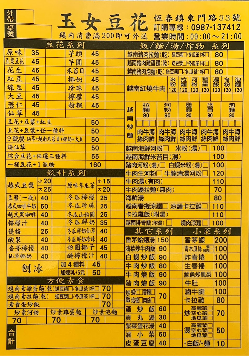 在恆春玩,找google評價而來的餐館。我們兩人點了越南豬肉泡麵、牛肉湯河粉、蝦青木瓜絲、越南春捲、魷魚炒鳳梨、紅豆豆漿豆花、酸果、九號餐豆花(有綠色的越南米苔目)。我吃越南豬肉泡麵,老實說我覺得沒有特別好吃而且豬肉有怪味所以我都沒有吃豬肉(有在想這是不是野豬或什麼之類的因為味道真的不太能接受)牛肉湯河粉不錯,且附上的金佶很大顆多汁。越南春捲好吃裡面附米粉包著口感很好。蝦子青木瓜絲好吃酸酸甜甜的而且蝦子應該是現撥的不像外面那一種放很久的。由於炒鳳梨算是蠻特別的一道菜所以我才點,魷魚的份量蠻少的,洋蔥倒是很多,恆春的洋蔥應該是不錯的吃起來甜味很重比較沒有辛辣味。越南米苔目口感不錯。9號豆花有點像是泰式的摸摸扎扎。豆花感覺應該有加椰奶之類的,味道還不錯算特殊但是豆花本身沒有那麼的濃密,感覺磨豆子的時候水加的比較多。我給他的評價應該是介於3.5到4分因為。如果豬肉泡麵的豬肉都是這個味道的話那我真的不推薦。豆花會只推9號,如果想要品嚐,本身的動為的話那可能別處會有更好的選擇。對了感覺老闆很愛物惜物所以一直跟我們說盤子裡的東西要吃完剩一點點都不要留。衝著老闆這句話我把它全吃光了?。這是對的不要浪費