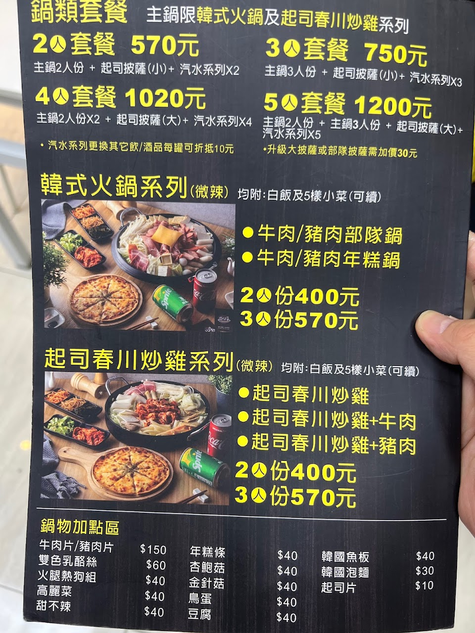披薩有蜂蜜味偏貴,普通好吃,但考慮價格cp值不高。春川炒辣雞,不是韓式的味道,偏台式,算不上好吃的韓式料理,就是普通台式豆瓣醬炒雞肉。我對於肉類的味道敏感,有一點肉腥味都不能接受,所以這雞肉我不喜歡,尤其咬到皮時?,然後超鹹,我吃重口味的,但這個真的死鹹。唯一優點是起士給的很足夠⋯沒了 …
