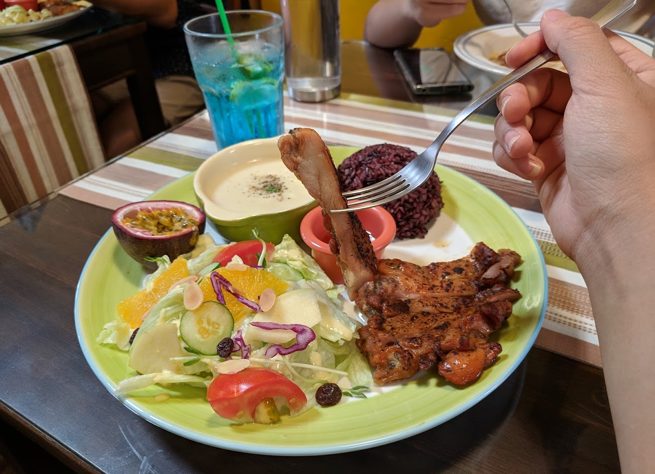 整間店很可愛 佈置的非常海灘風 食物的話普普而已, 紫米飯太硬太乾,無骨雞腿排很死鹹 其他都表現普普