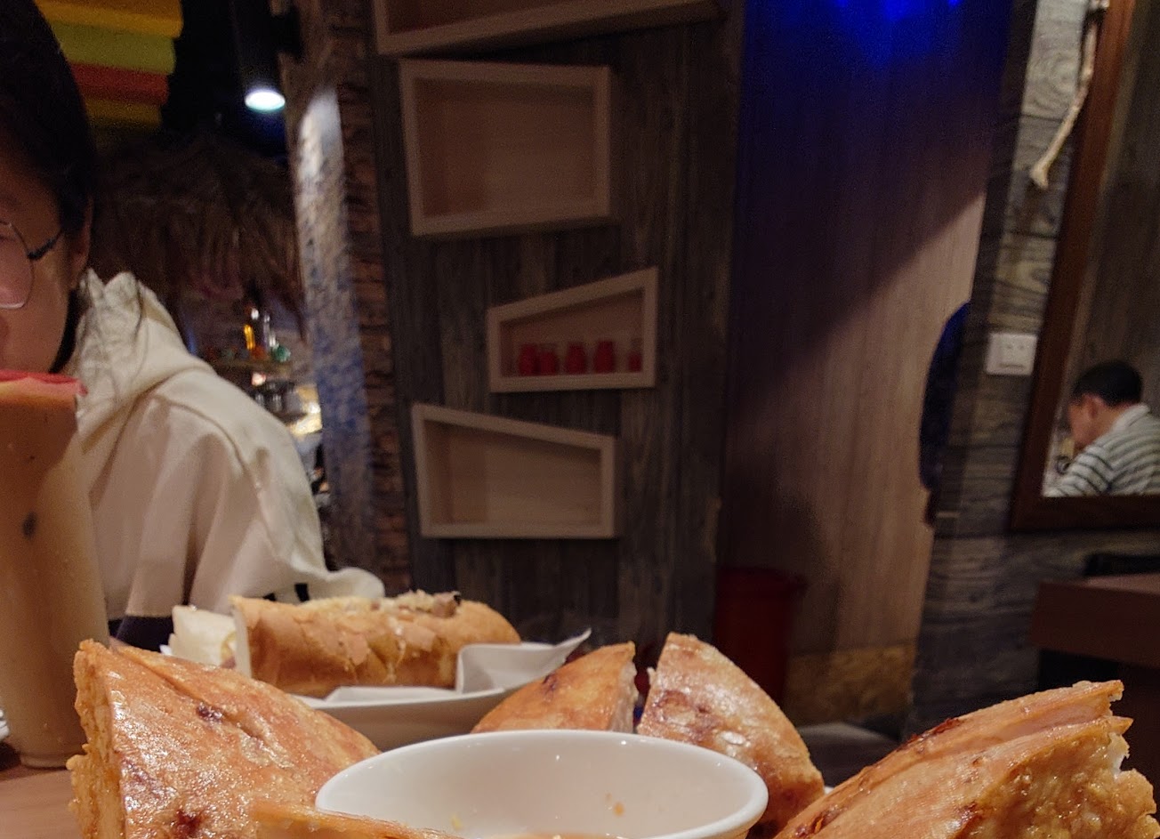 每份餐點份量大概都是給兩~三人吃的,以價格來說相對划算~ 上餐速度頗快,點完餐後沒過多久香茅雞肉飯便上桌了,香茅雞肉真的煮得非常入味,又鹹又香及其下飯 而第二道上來的則是春捲,一份四條,一條的寬度至少大概有四、五公分那麼寬,配上其調製的醬汁非常好吃 再來就是牛肉河粉湯,份量不小,湯頭非常鮮甜 而法國麵包的表現也不錯,可惜這道份量沒前幾道大,要分著吃的話比較困難 最後就是重頭戲 – 月亮蝦餅~它的厚度就跟波士頓派一樣!所以我都叫它「波士頓派月亮蝦餅」,裡面含有非常多的蝦肉,讓你每一口一定都可以品嚐到蝦子的鮮味。個人覺得這道一定是來這邊必點的一道菜 餐點:5 服務:5 氣氛:5