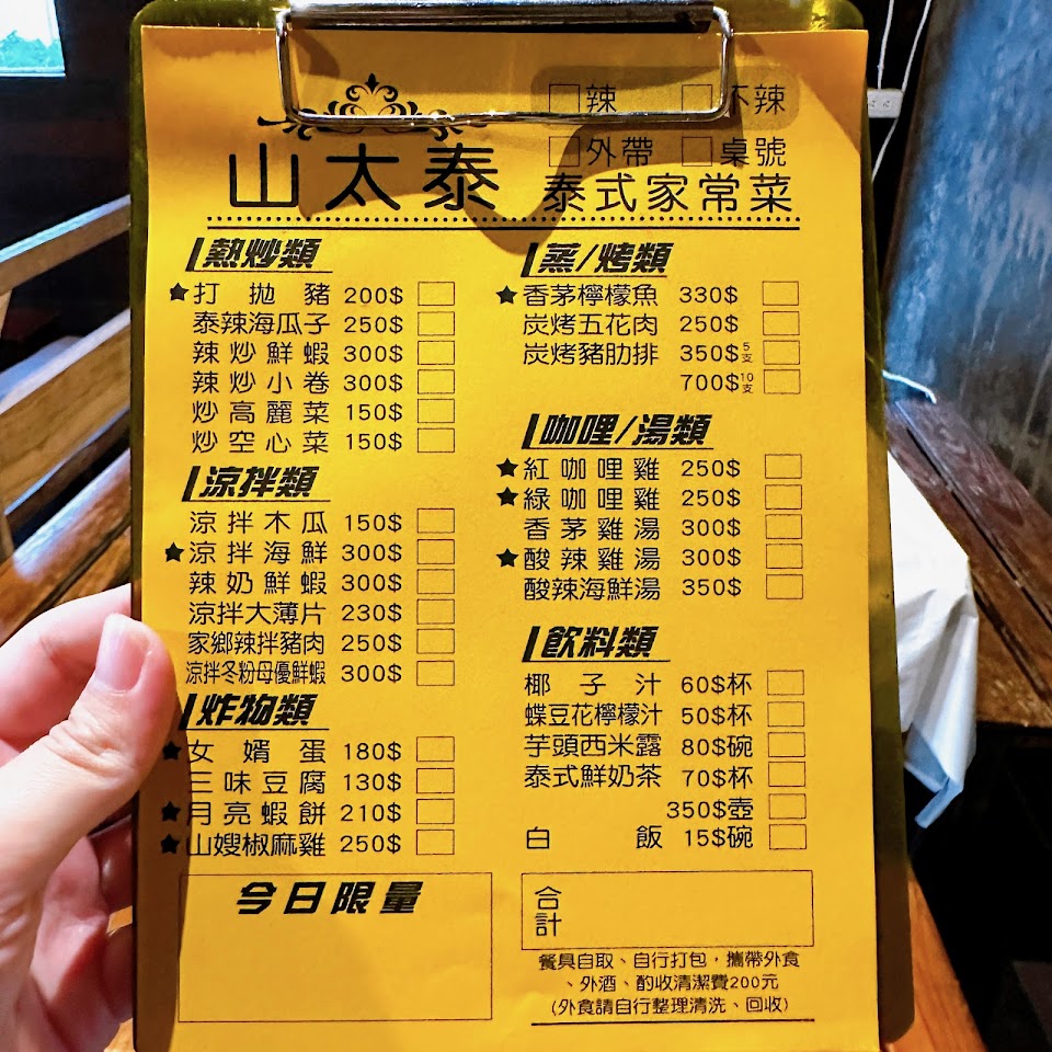 [山太泰泰式料理] 不起眼的小店面,沒有過多的裝潢; 無意中在google上看到,想說試試看,畢竟恆春沒有讓我覺得好吃的泰國菜?? 今天點了:涼拌木瓜絲、椒麻雞,東炎湯,滑蛋咖哩蝦及打拋豬肉: 用料都很大方,口味也覺得不錯;很下飯,尤其是椒麻雞最讓我驚艷,酸酸辣辣的,完全合口味??? 希望之後有機會在店內用餐,應該會更好吃❤️ 所有的辣度都選中辣,下次可以試試看大辣???? 另外,因為疫情關係,外帶有9折優惠
