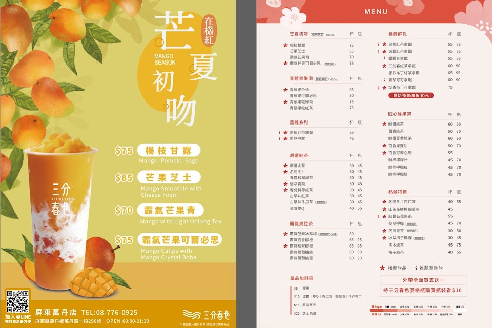三分春色 屏東萬丹店 | 屏東萬丹手搖飲料店 | 下午茶冰店 | 外送茶飲 | 珍珠奶茶 | 奉茶日 | 萬丹路飲料店