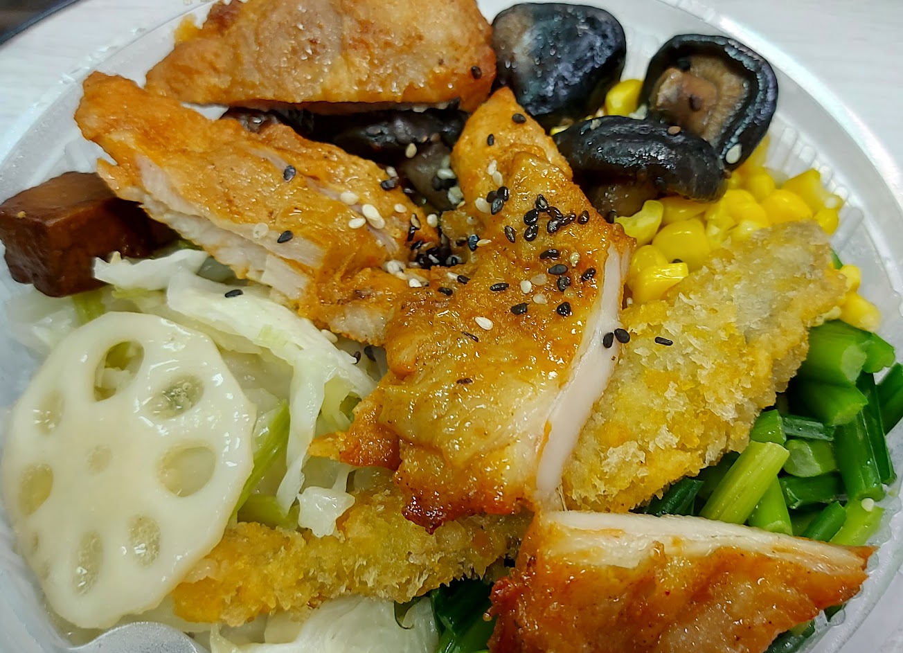 第一次吃覺得很喜歡,我吃的是無米便當,是以地瓜取代米飯,有主食雞排、四五樣配菜,最底下還有一層冬粉(看粉絲頁說是為了吸油),用料非常豐富也美味,價格也很實惠,非常推薦!不過個人口味覺得還可以再少油一點點~