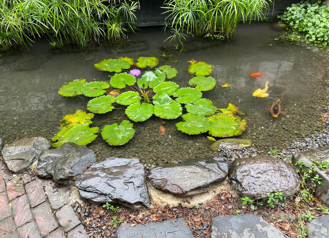外面有綠意庭園和游魚池塘,種了許多鹿角蕨,還有可愛的店狗。