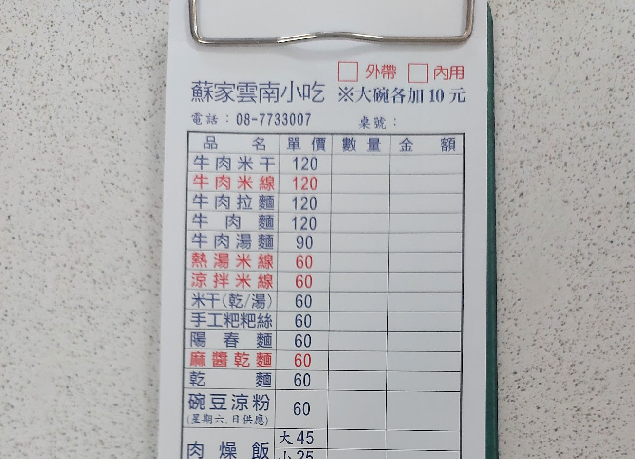 跟陳家比起來,這裡的蒜頭酥風味較淡量也少些,湯頭滋味也是略有不同。不過平心而論,對於一碗售價不到佰元的牛肉麵,看看碗裡那兩大…片厚度超過1公分的牛肉塊,實在令人不禁要大大稱讚店家一番,實在是太佛心啦!!這在其它縣市地區,恐怕得要花上1、2佰元才能吃得到。蘇家雲南小吃的牛肉不只有麵條,還有米干與米線。另外特別的是只在週六、日才有販售而且極為搶手的豌豆涼粉,動作慢了你就吃不到!再加上特殊的辣味酸肉(類似粉腸)以及清爽涼拌青木瓜絲,都是來此必嚐的美食哦。