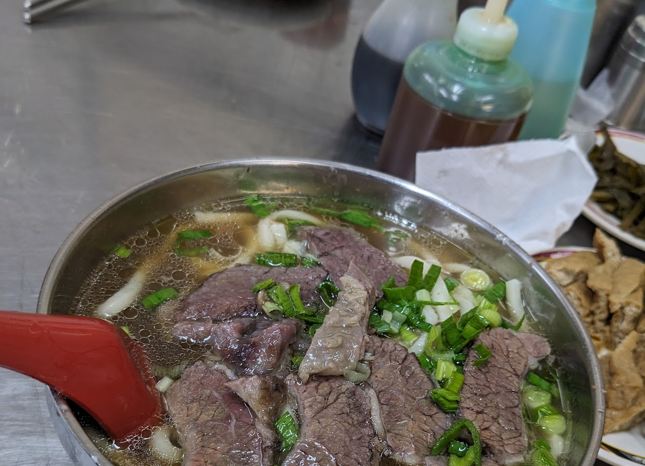 牛肉薄的&厚的都有、薄的多些,價格樸實,豆鼓超香,酸菜蒜頭醬料等都自取,排骨亦入味,唯麵條吃不習慣有一點點嚼勁像是米苔目的感覺,整體是不錯。