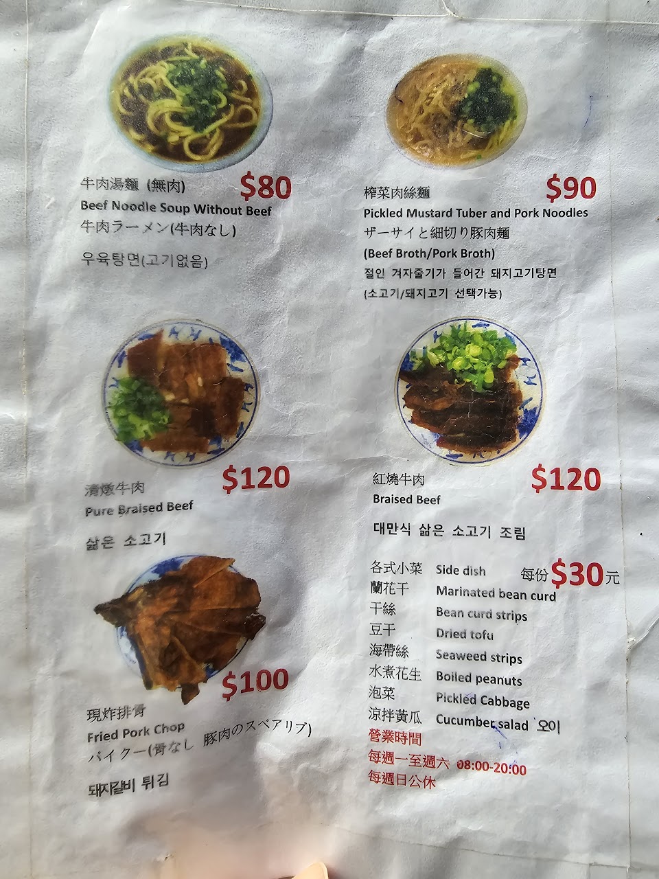紅燒跟清燉感覺湯底都一樣,只是紅燒味道比較重一點,牛肉燉的很嫩,麵的口感一般般。小菜一盤20$很俗但吃起來很普通。桌邊有鹹菜、辣椒醬免費無限量供應!