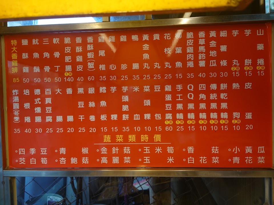 兩種黑輪個約6個,芋ㄍㄨㄟˋ1,米血2,螃蟹1,魷魚1,鹹酥雞1,百葉豆腐1,雞皮1