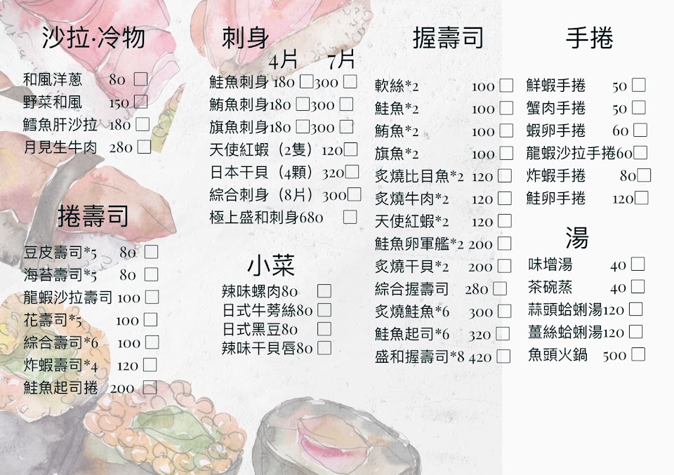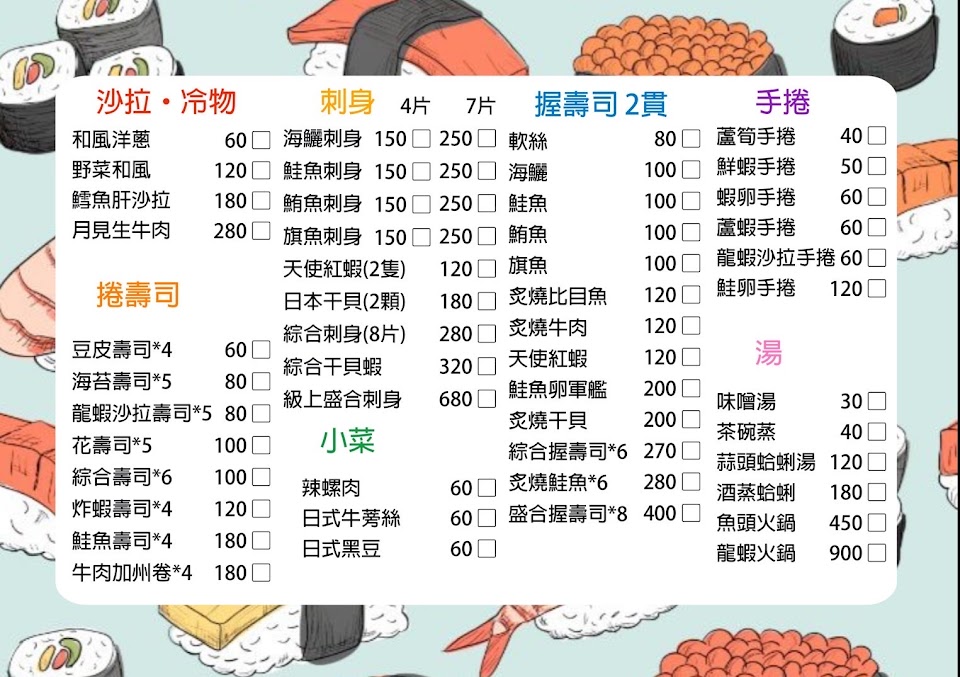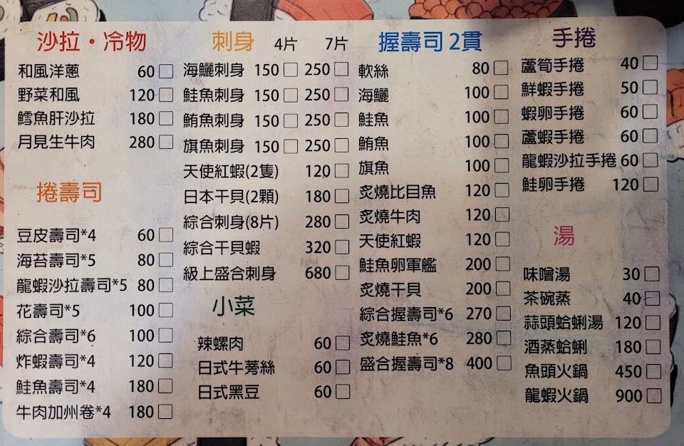 價格偏貴/食材沒有很新鮮/份量十足/店員親切/味道普通/手卷高麗菜絲很苦