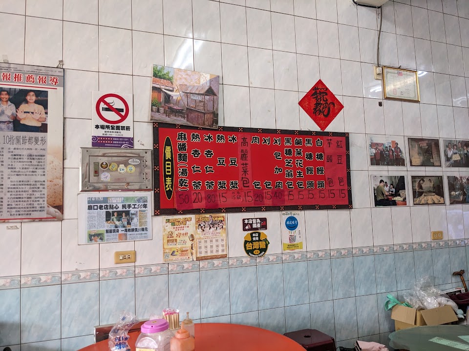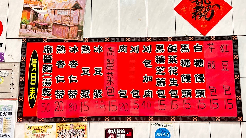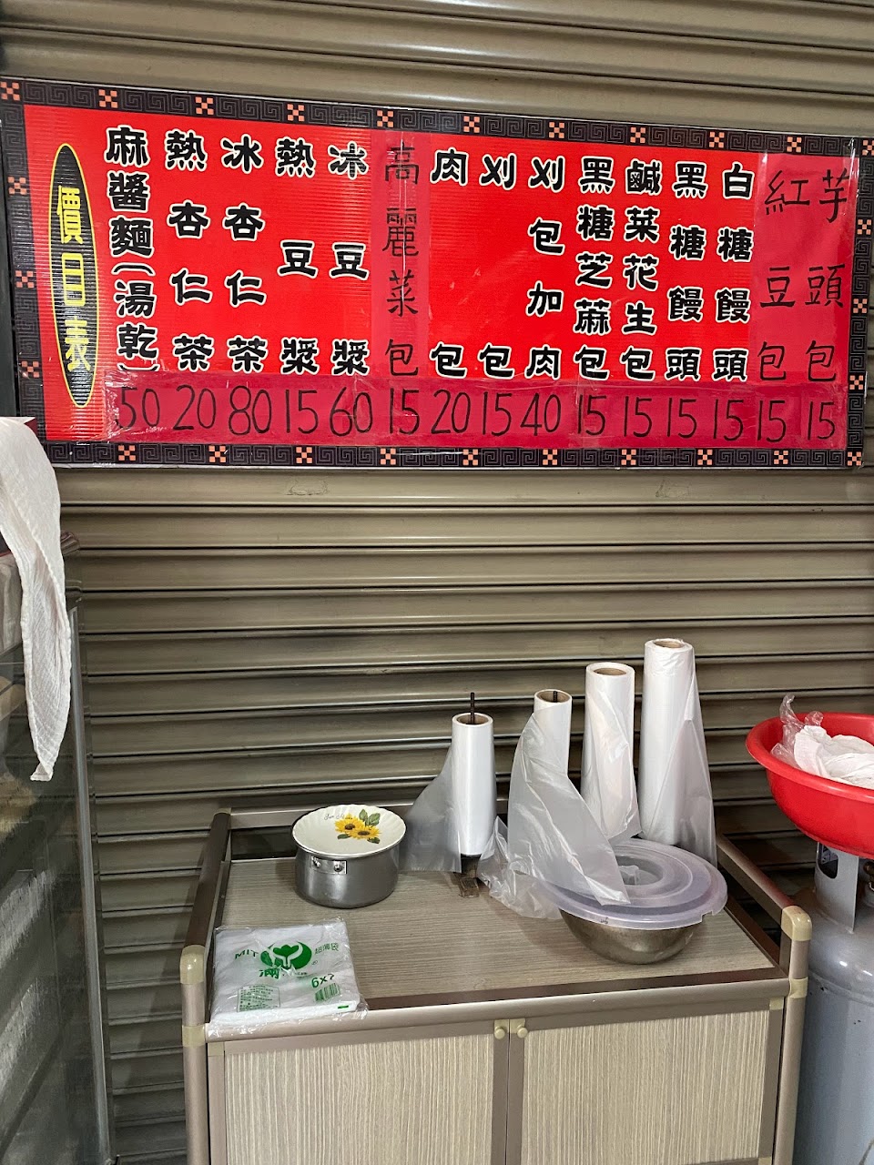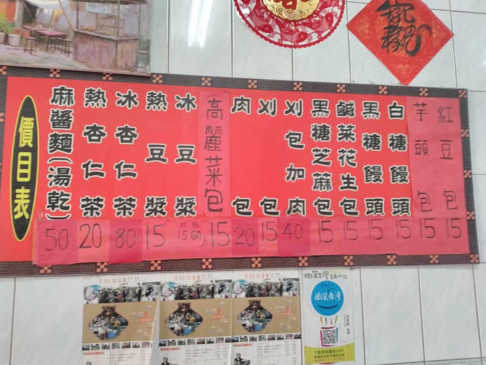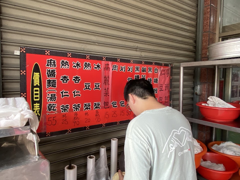 兩人點了芝麻包,肉包,酸菜包,加肉刈包,麻醬麵,杏仁茶,每種都好吃;回程再外帶一瓶大瓶杏仁茶
