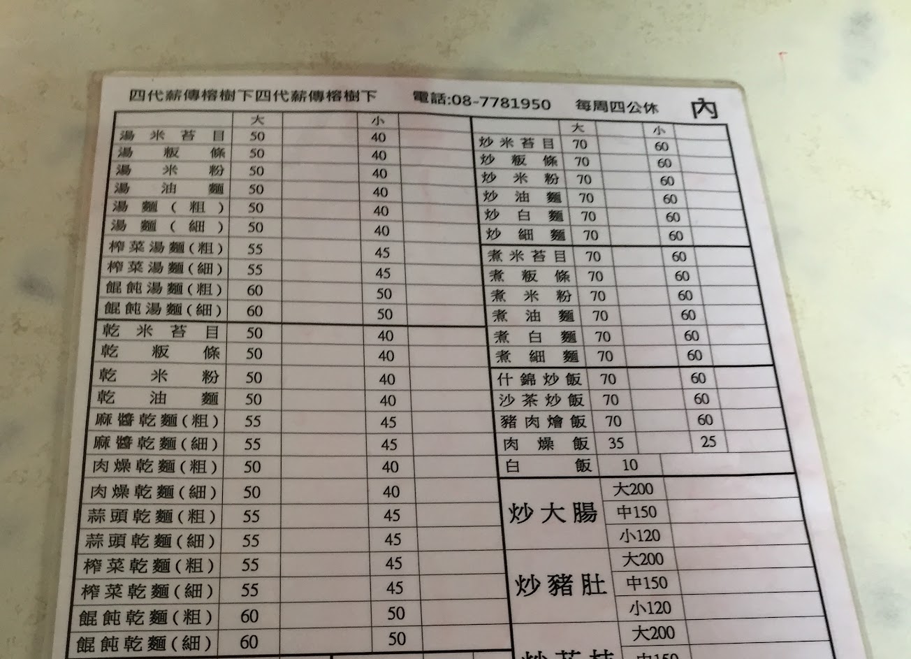 榕樹或許因為道路拓寬的關係,已不見其蹤跡,但是店名依然掛著,該也是顧及老顧客懷念之故。或許因為店面桌次座位的關係,經過幾回在店面外面候位的顧客,跟隔壁阿英麵店一樣並駕齊驅。這次光臨,才發現隔著馬路對面,還有其擺桌營業的空間。只是店家端菜,得頂著太陽、月亮,露天灰塵端承到對面,但或許顧客也不介意才是。