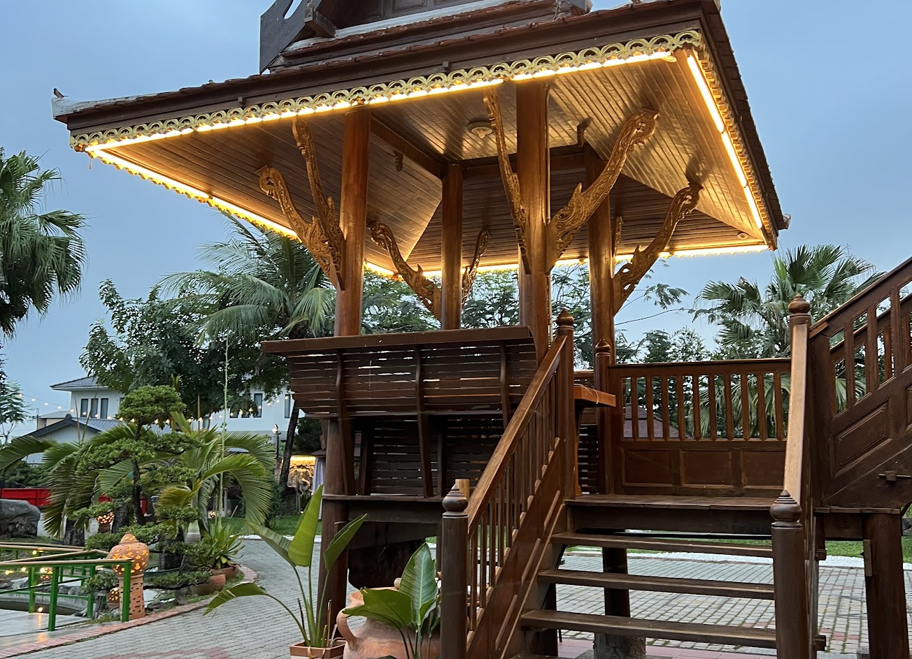 由屏東當地的朋友帶來 一到門口就被他的庭園造景吸引住了感覺很用心的一家泰式餐廳 但是服務人員似乎少了溫度 臉上沒出現過笑容 這點可能有待改進 來到這裡可以在戶外選個自己喜歡的涼亭跟三五好友盡興聊天也不怕吵到別人 是個可以開心拍照的好地方如果不用餐只來拍照在門口就會有工作人員收100元的入場費 但還是可以抵低消點杯飲料在涼亭發呆聊天 真的是個悠閑喝下午茶的好地方 只是戶外用餐可能需考慮蒼蠅飛來飛去有點煩 可以考慮在室內區用餐另外餐廳也貼心的有提供防蚊液可噴 菜的份量還蠻多的 大概都是四到六人份的 如果只有兩三個人最好斟酌一下點的份量不然會吃的很撐喔⋯⋯