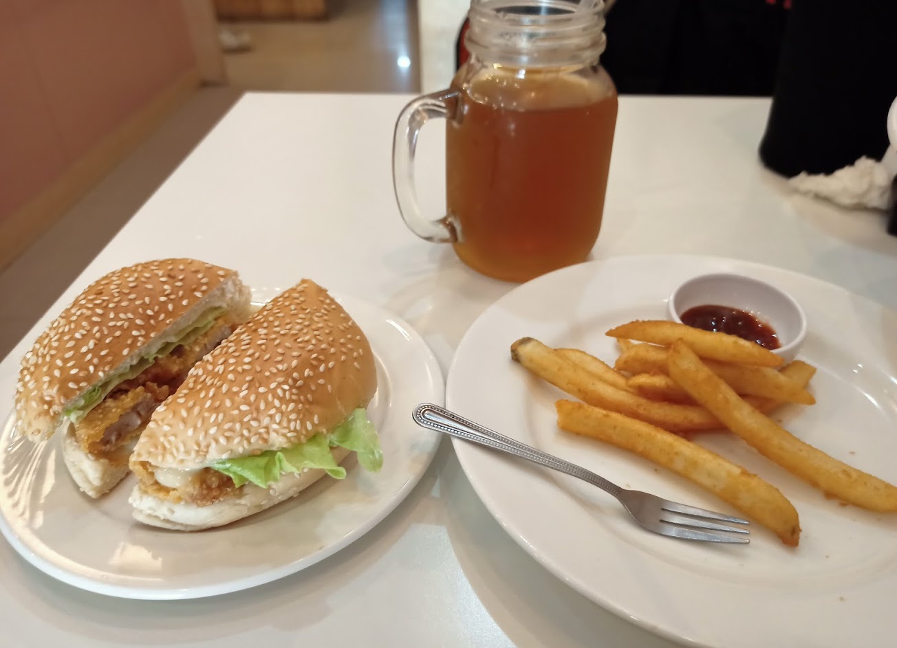 單點兩個漢堡等了快一個小時才送來而且還搞錯餐點,店裡明明人手那麼多但送餐的速度真的是慢到很誇張,55塊的卡拉雞腿堡看起來也不怎麼樣,吃起來很黏,路上隨便找一家早餐店同價位的漢堡都會比這個還好吃,菜單上的餐點也都普通感覺沒什麼特別,整體CP值相當低,完全不建議來用餐。