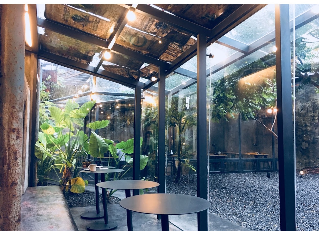 輕鋼構,做對比式工業風來與舊材料老空間對話,帶入植物,打造出明亮舒適的咖啡點心空間。