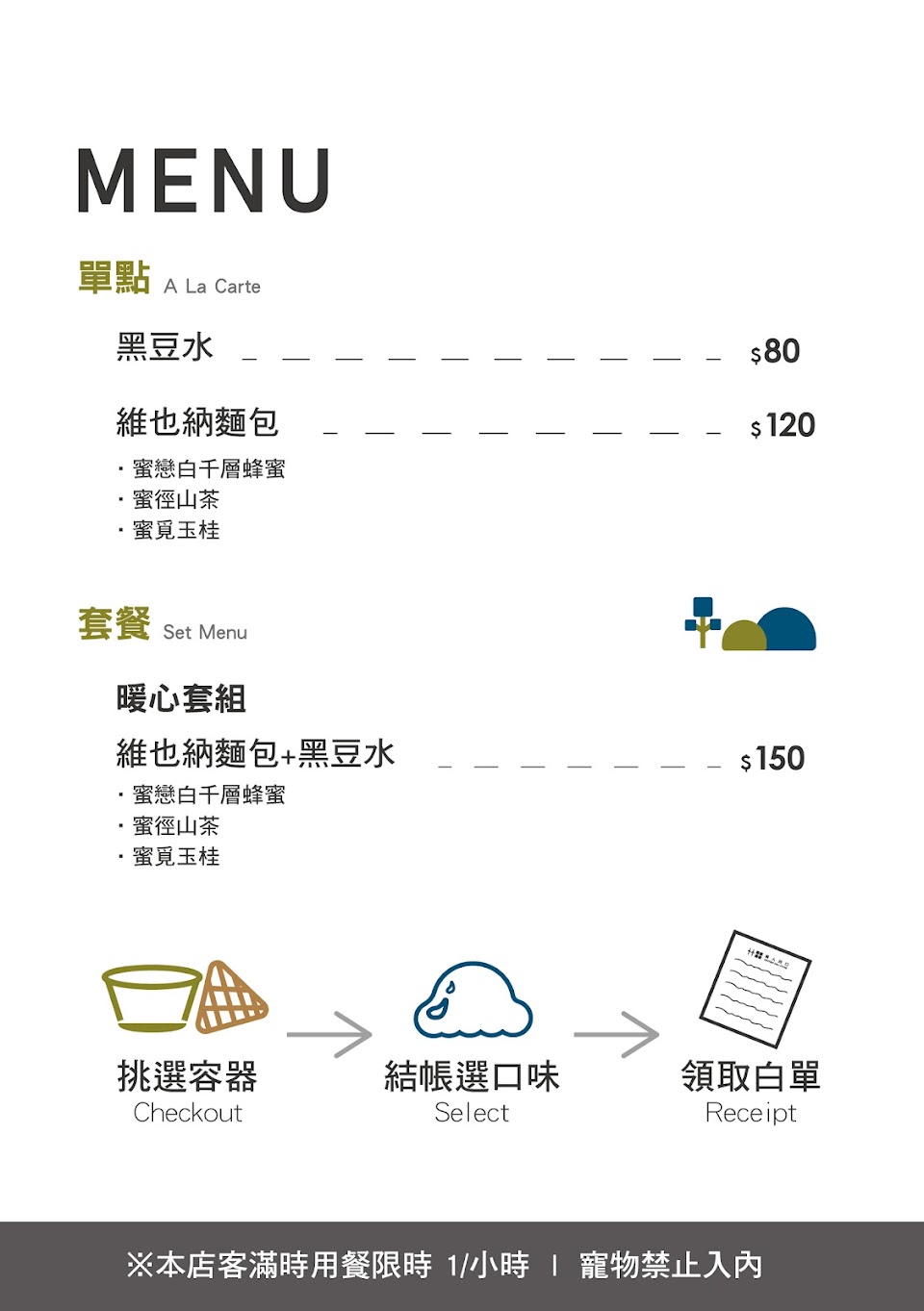 小杯雙口味120/大杯三口味160。點了茶豆、檸檬、醬油、橄欖油、巧克力,各具特色非常推薦!檸檬是自家種植、豆油伯醬油口味(此店是關係企業)、橄欖油淋在冰淇淋意外的適合!巧克力則是使用屏東可可。雖然單價真的偏高,期待二訪。