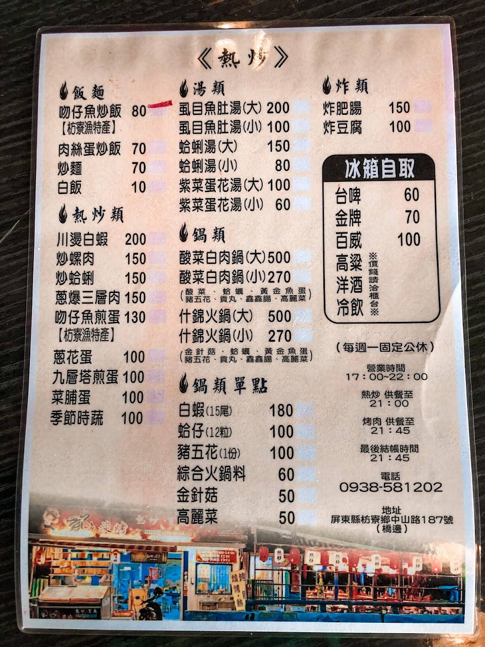 坐在小漁港旁吹著舒服的海風燒烤跟熱炒上菜的速度超級快,口味也不錯重點價格非常便宜。