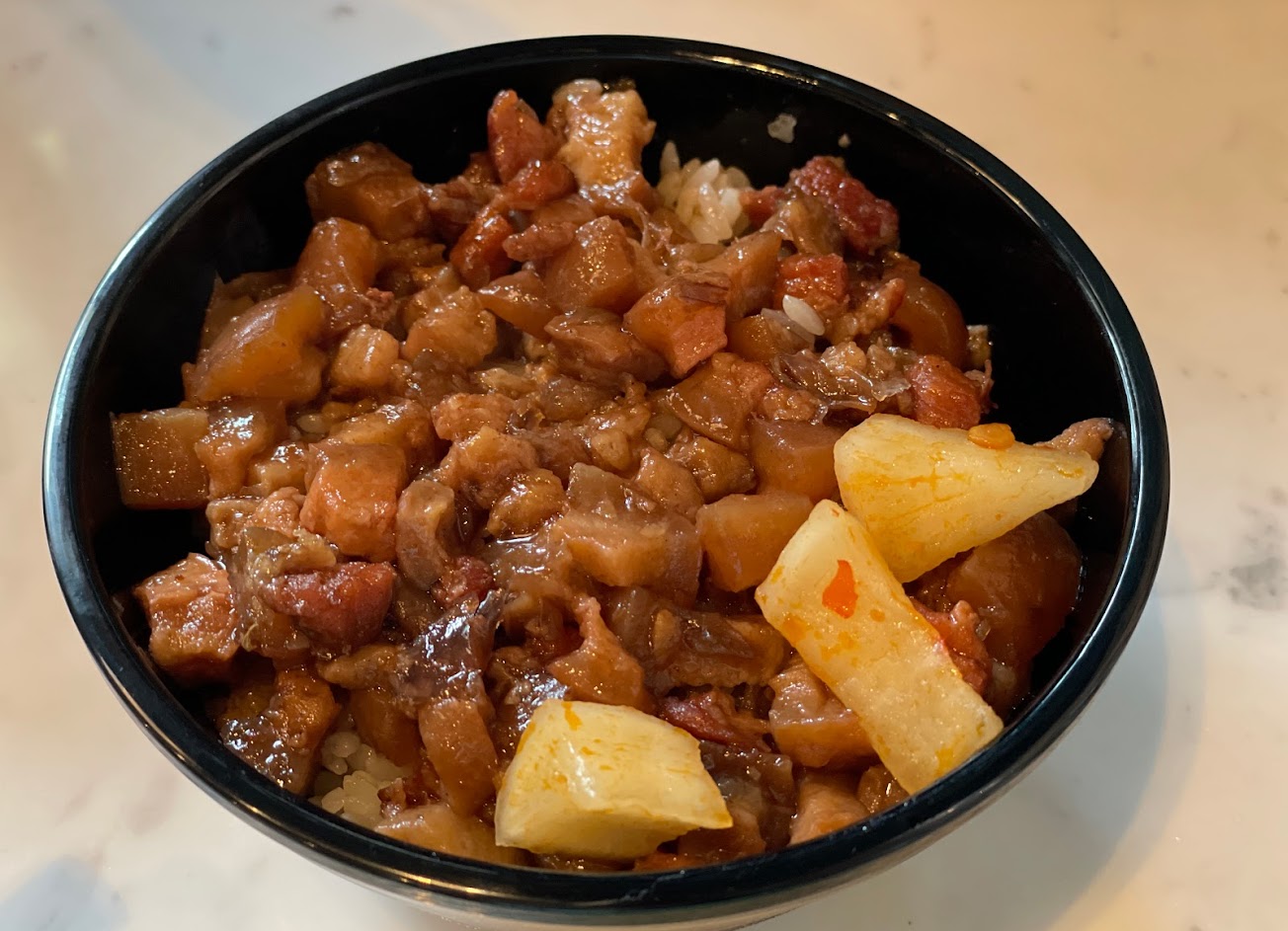 ❸滷肉飯是豬腳滷法,油脂Q彈度好。