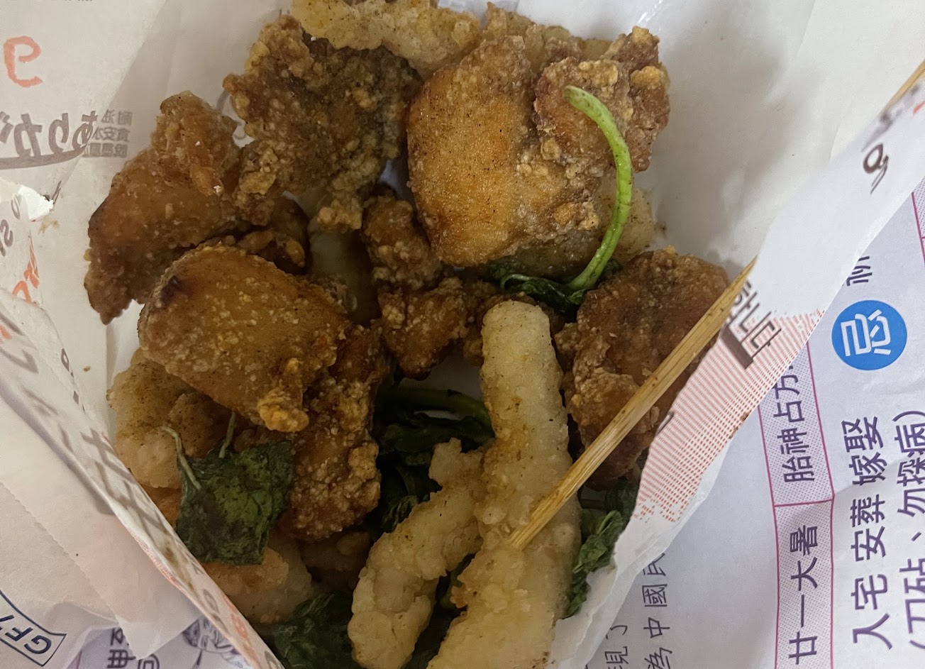 上禮拜吃了獨特的沾醬口味鹹甜鹹甜的雞肉串/里肌肉包蔥好吃,韭菜餃子炸的剛剛好咬下去的香味配上胡椒粉的味道美味以上都有沾醬,薯條真的也不錯。蠻優的味道,雞排吃起來有古早味的口感好吃美味。老闆也很親切。