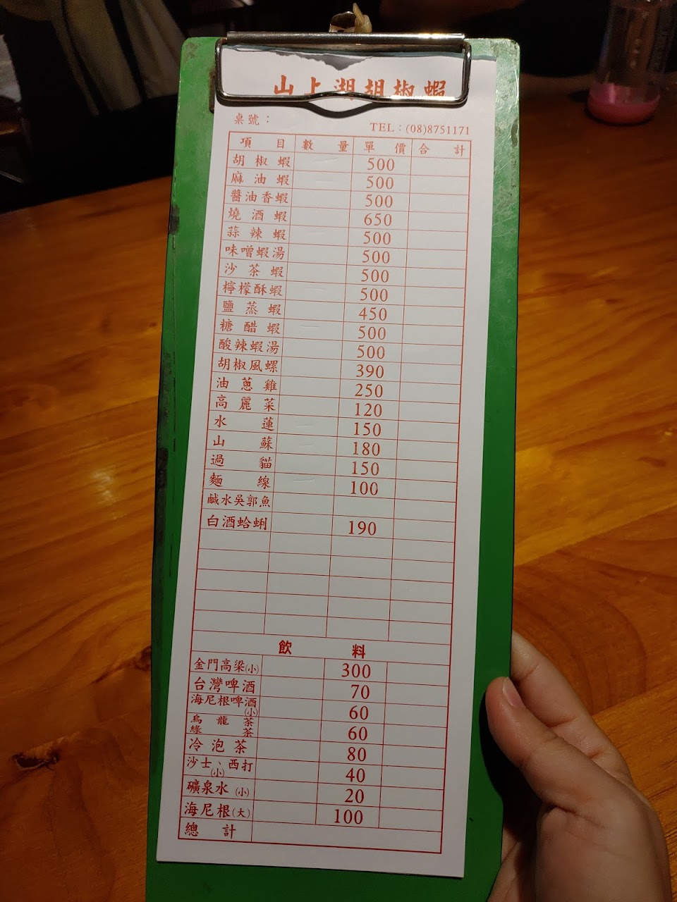 我們當天點了胡椒蝦、蒜辣蝦、味增蝦湯、檸檬酥蝦、胡椒鳳螺、油蔥雞、水蓮、麵線、酒水飲料。