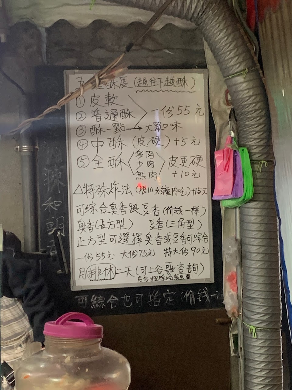 餐點的酥度、臭或不臭、辣椒的選擇,都可以客製化,相當特別。既然可以選擇,店家對酥度的掌握確實很準,皮酥肉嫩,相當好吃。點餐也很有耐心,不會有匆匆忙忙的煩躁感。