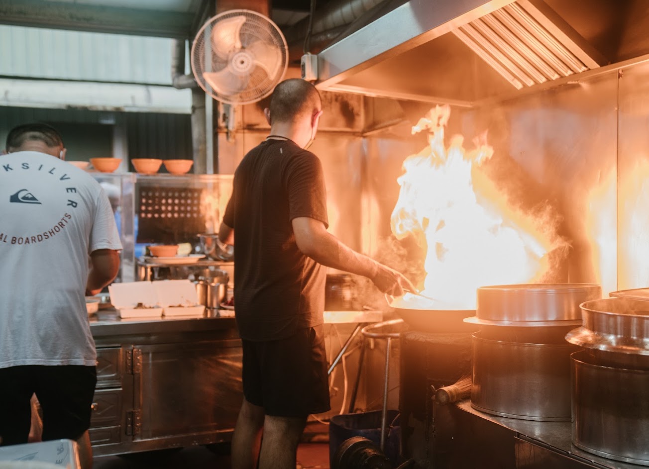 絡繹不絕的人,麵一大鍋一大鍋的炒,結果夏天的店內為了美食吹著大風扇,呼呼聲伴著汗,辛苦只為這炭火快炒。