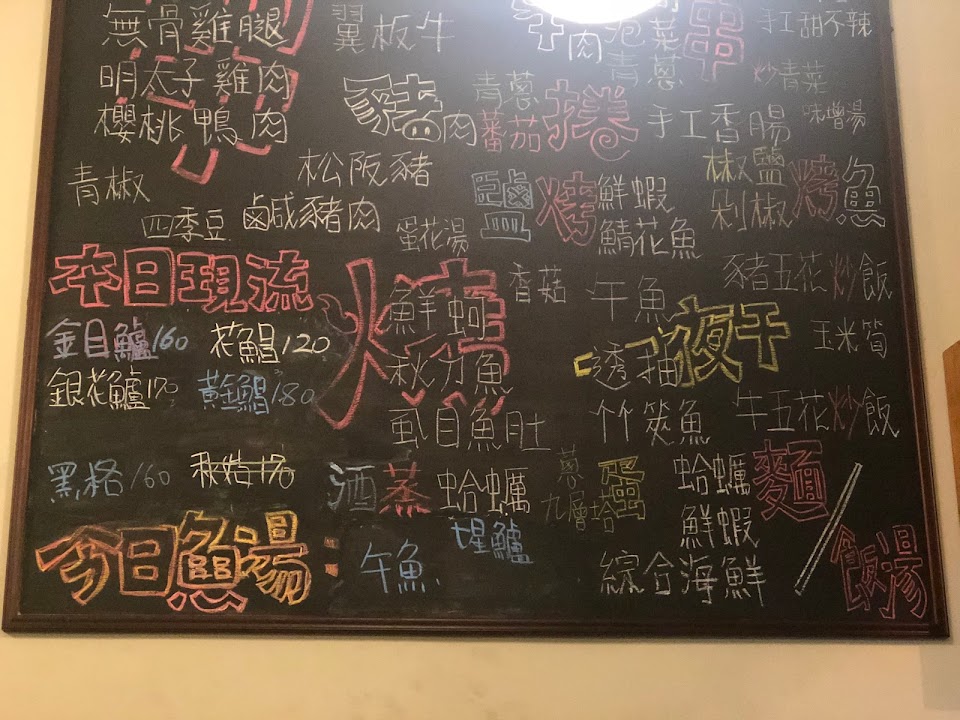 菜單可參考他人照片,主要可分為主食(炒飯、海鮮粥麵)、燒烤、鮮魚、海鮮及酒(國內外啤酒及日本燒酒),食材新鮮料理恰當,做為正餐晚餐或宵夜小酌皆合適美味。