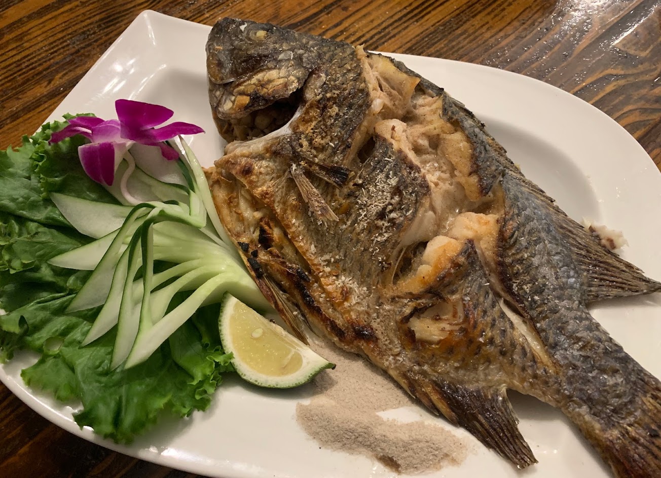 ?鹽烤魚-其實就是吳郭魚而已,烤得魚肉鮮嫩魚皮酥脆,魚內還包有很多大蒜,調味不錯