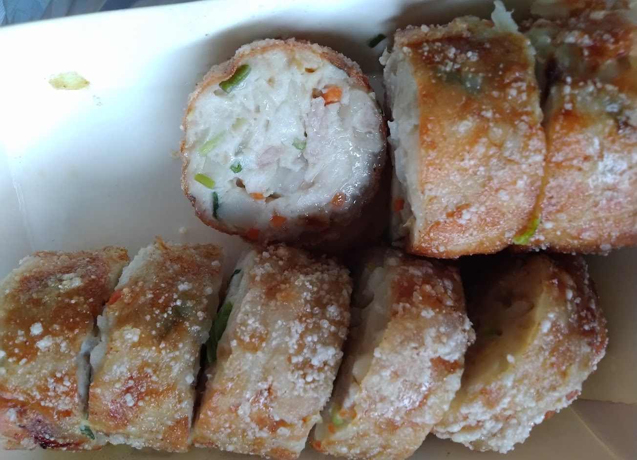 每天現炸,熱熱的吃真的很好吃,餡料是用洋蔥?、荸薺、魚漿等食材混合,在用豬網絲包起來,外皮吃起來很薄炸的酥脆,內餡荸薺卡滋卡滋的口感,整份不沾醬就很好吃?
