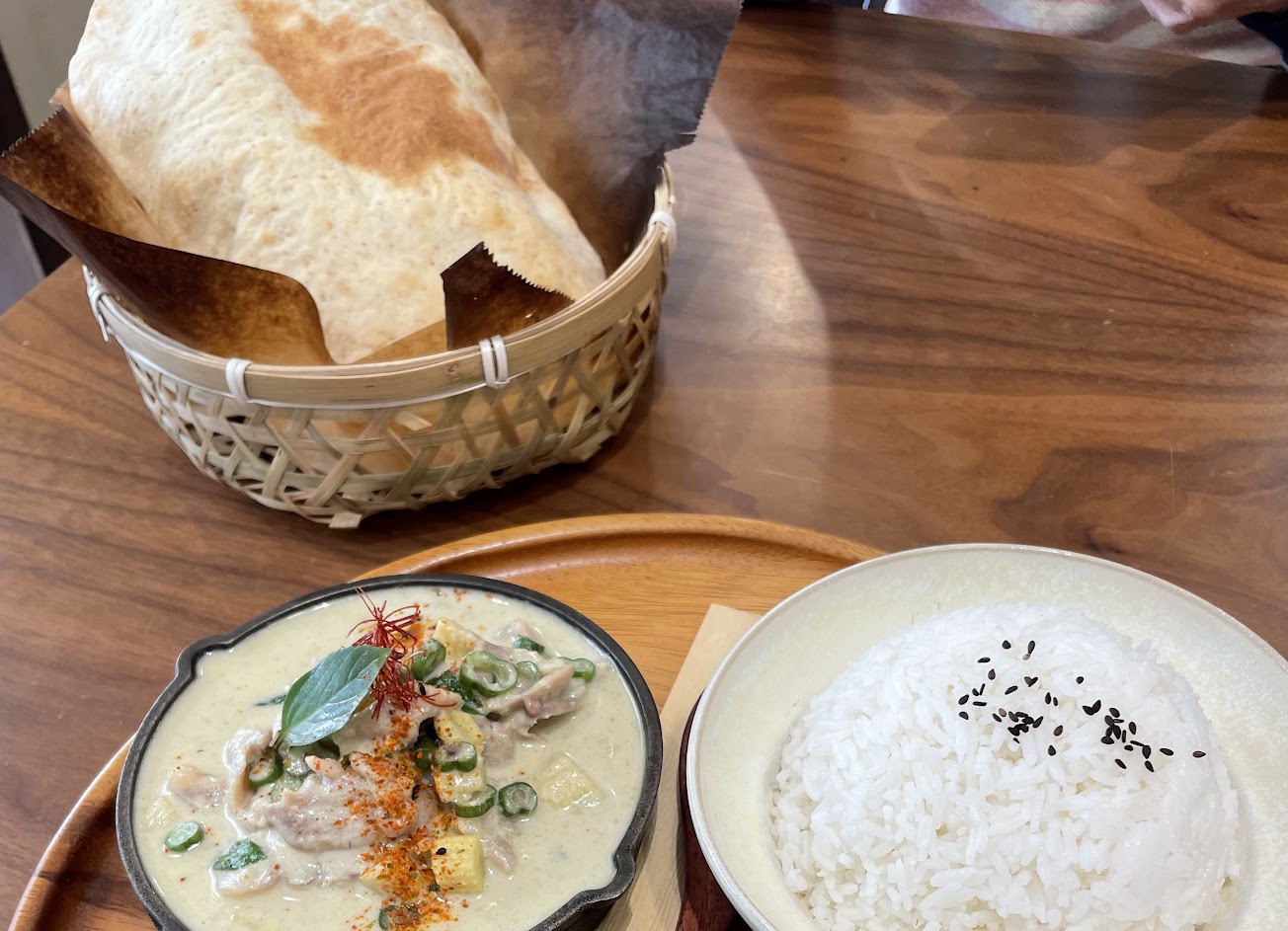 據說是排隊名店~可能是早到,運氣很好的沒排到隊~店內的裝潢風格有懷舊的文青美感,二樓還有看起來很舒服的和式座位~點了烤餅套餐(特製咖喱)與穀谷綠咖哩雞肉飯,兩樣都很好吃,咖喱香氣濃郁夠味,烤餅熱呼呼軟硬適中,很好的扮演了吸附咖喱入口的角色~硬要比較的話,個人偏好特製咖喱多些,因為香氣較為鮮明也較有層次,綠咖哩的部分,因為用了椰奶去調和香料的味道,使得綠咖哩的味道較為溫潤,但是就少了香料那直擊味蕾的味道~