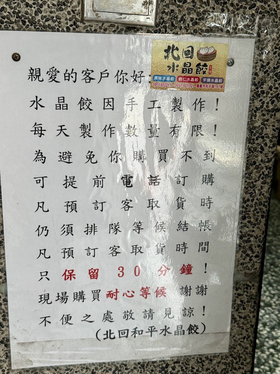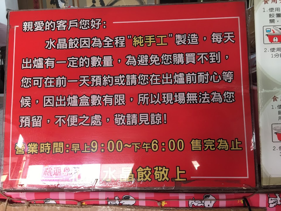 平日中午去,水晶餃差點被前面的一組民眾買完,運氣不錯有買到,真的好好吃!大家有想要建議先預訂,免得來的時候撲了個空。