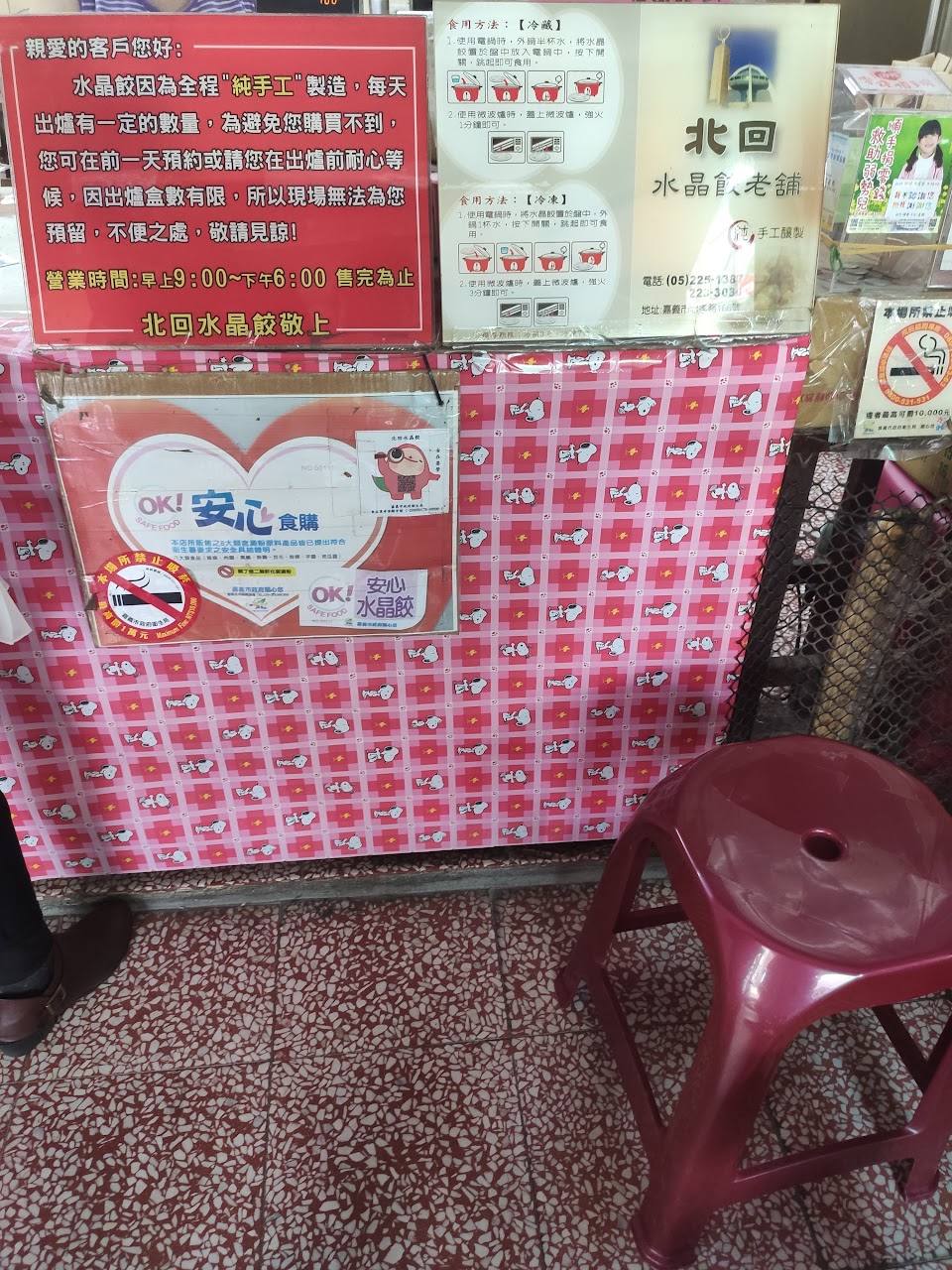 規矩就是先排隊,一爐有10盤,一盤25個,會有人員來詢問需要幾盒,一盒5個售價80元(有發票)。晚到或是剛好前面掃完一爐就只能再等下一爐。最早第一爐是9:30左右出爐,在9點前排隊應該都能買的。此外,工作人員表示沒賣生冷未蒸熟的水晶餃,旁邊的圖示說明是讓了解當天沒吃完若冷藏或冷凍後如何處理的方式。