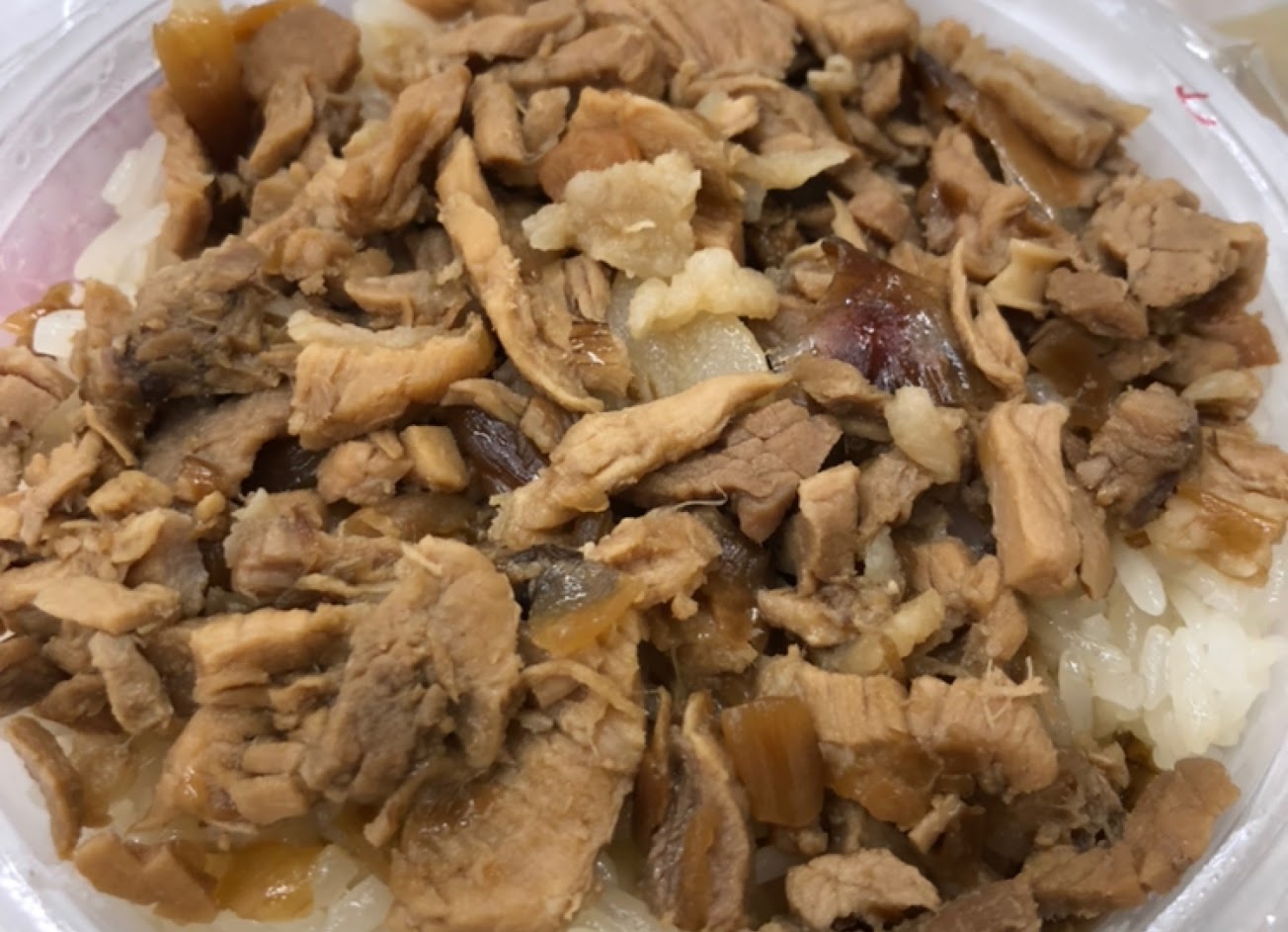 以獨門醬料與豬油拌勻的糯米飯上,佈滿以瘦後腿為主 + 油蔥、蝦米同炒、同滷的滷肉片,構成獨特的淡淡鹹香與甘甜,美味更是加乘。