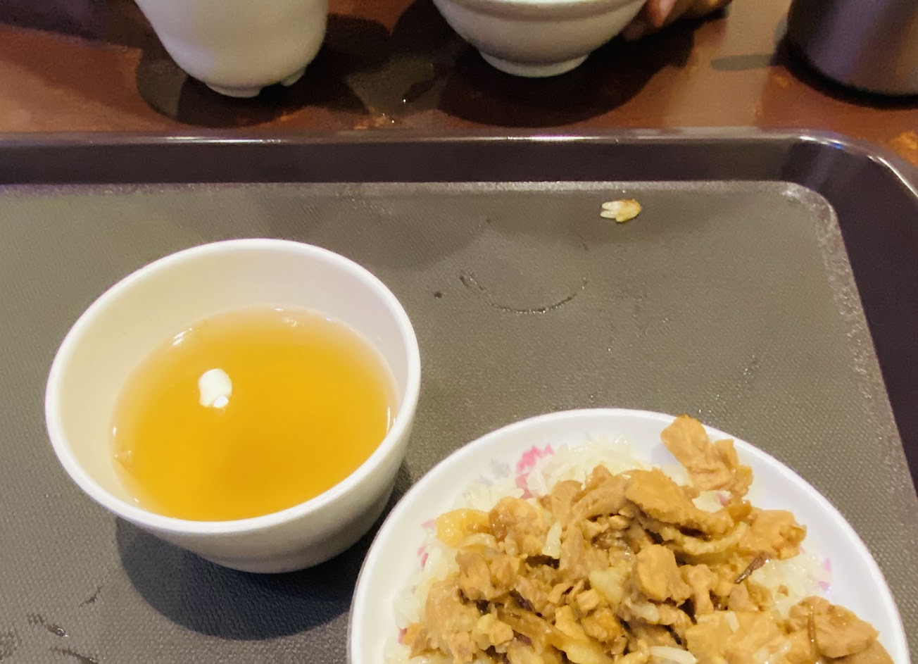 米糕的作法是底下油飯,上面再淋上類似肉燥醬料,如果沒有另外加點湯的話,會附上一碗清湯(喝不夠可以免費再續)