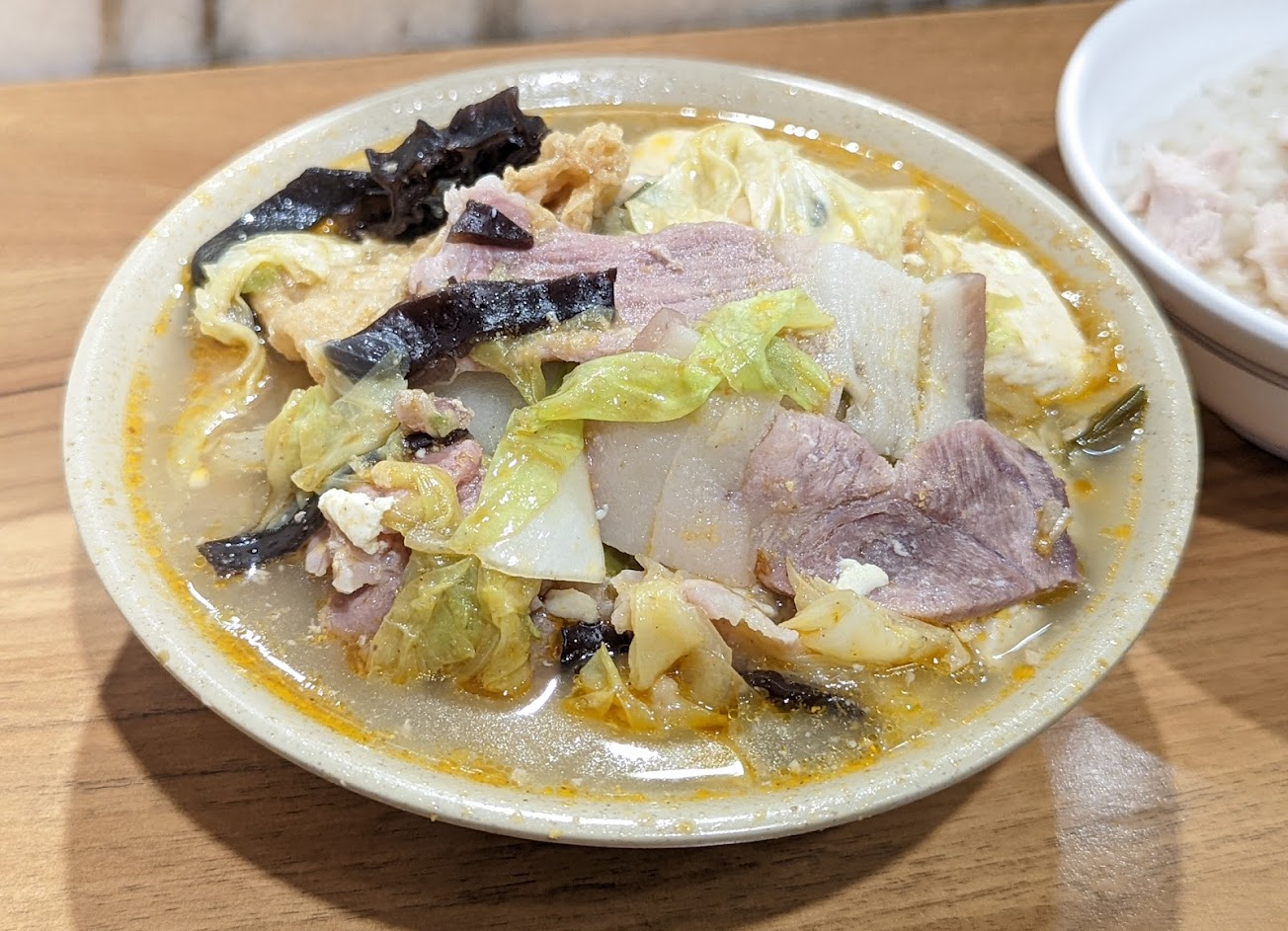 湯頭裡面有豆皮黑木耳豬肉片蝦米白菜..等