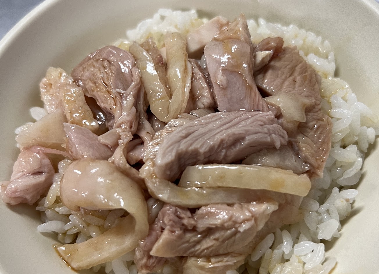 火雞肉片飯:只有幾片勉強算肉片,其他是肉絲肉塊,還有兩塊純粹只有皮。飯有醬油味但感受不到雞油香,有些飯粘成一小糰。
