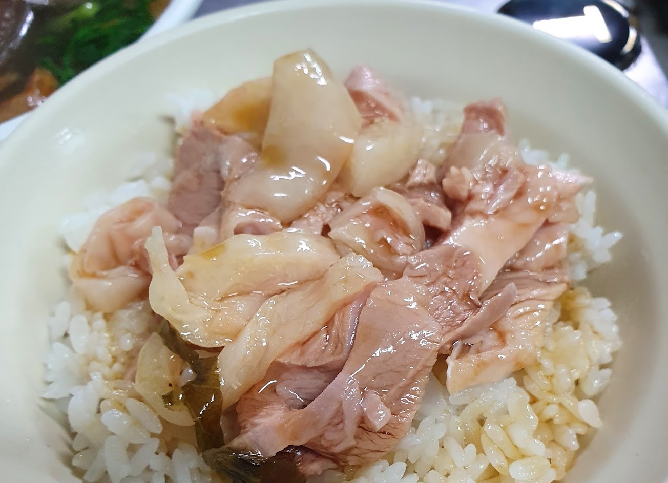 肉片盤軟嫩適中,皮吃起來有Q彈,飯的部份雖不到一等米等級,但米粒還是很飽滿不軟爛,雞油加的算是剛剛好也不會過鹹過油,另外還點了筍干,酸菜味很明顯,可惜都太長一條,微軟爛不夠脆,結帳小妹好像很漂亮?