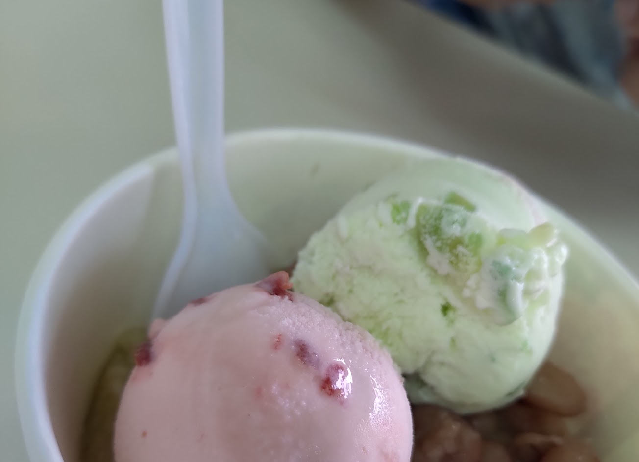 懷舊的味道。現在的價格是 40 新台幣 2 勺冰激凌加上雲豆和綠豆冰糕。我有李子和醃芒果的味道,但你只能嚐到人造的綠色和粉色。仍然,它嘗起來很古老,有點有趣。