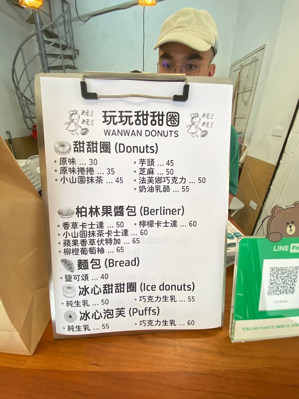 往停車場走 突然看到 玩玩甜甜圈的招牌 進去後老闆熱心提供試吃 哇!和我以前吃到的口感差很多 好好吃喔 買了生乳泡芙、鹽可頌、原味甜甜圈 真心覺得值得推薦