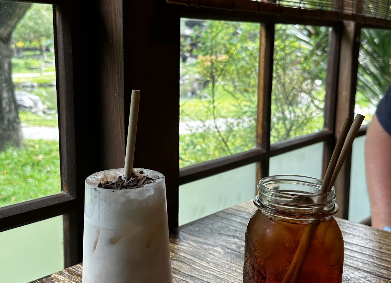 建築採日式風格,進去後空間滿小的,常常要低頭,但是內部裝潢也是十分用心,很漂亮、精緻,氣氛美燈光佳。這次坐到窗邊的位子,小小一個坐起來很溫馨,可以看到外面遊客逛園區的慢悠景像,陽光灑在樹蔭間和池塘上的美景。
