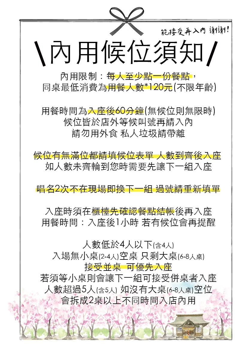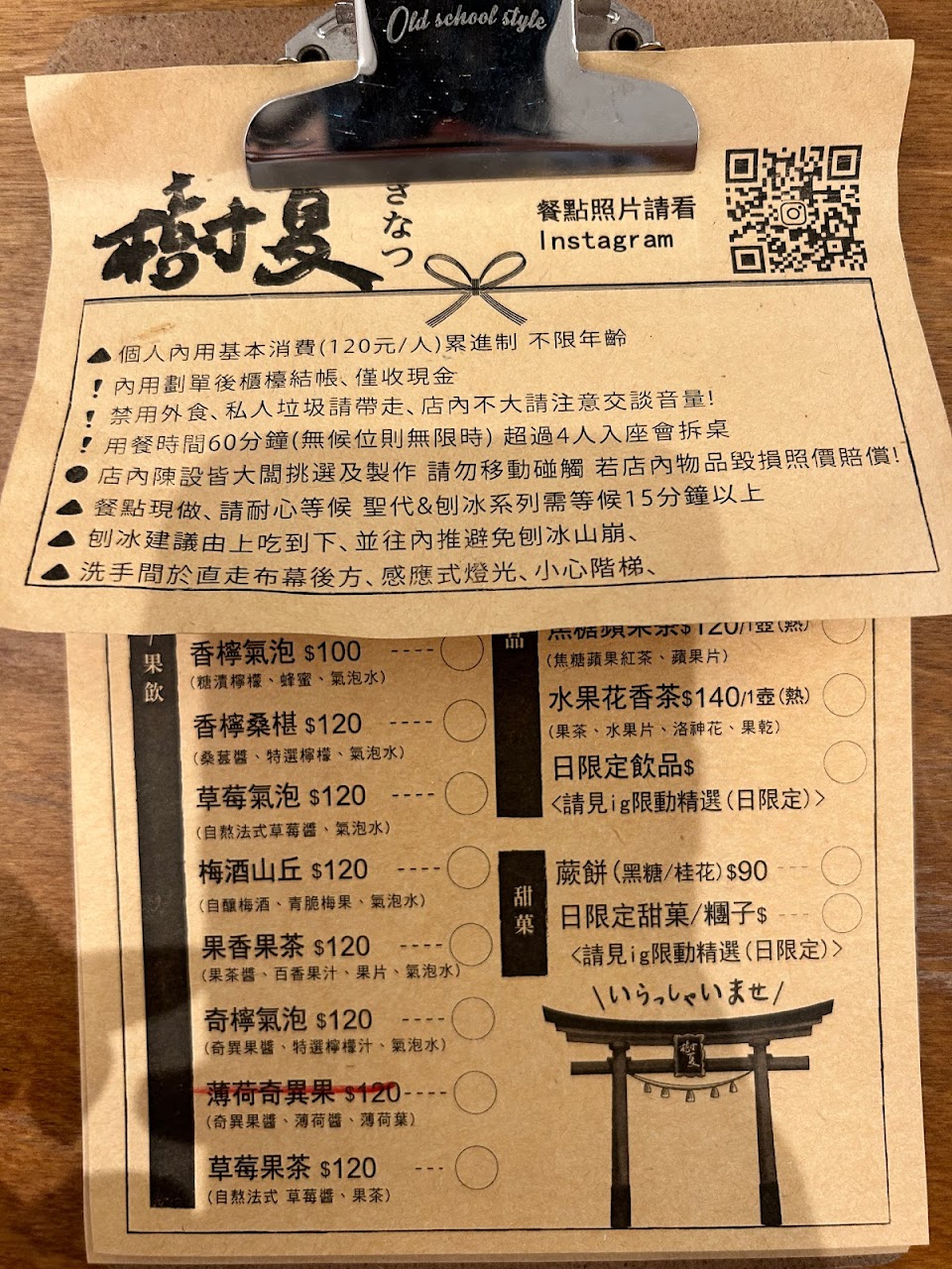 ?販售包括日式團子、刨冰及各式飲品,內用低消120元,按人頭累計。
